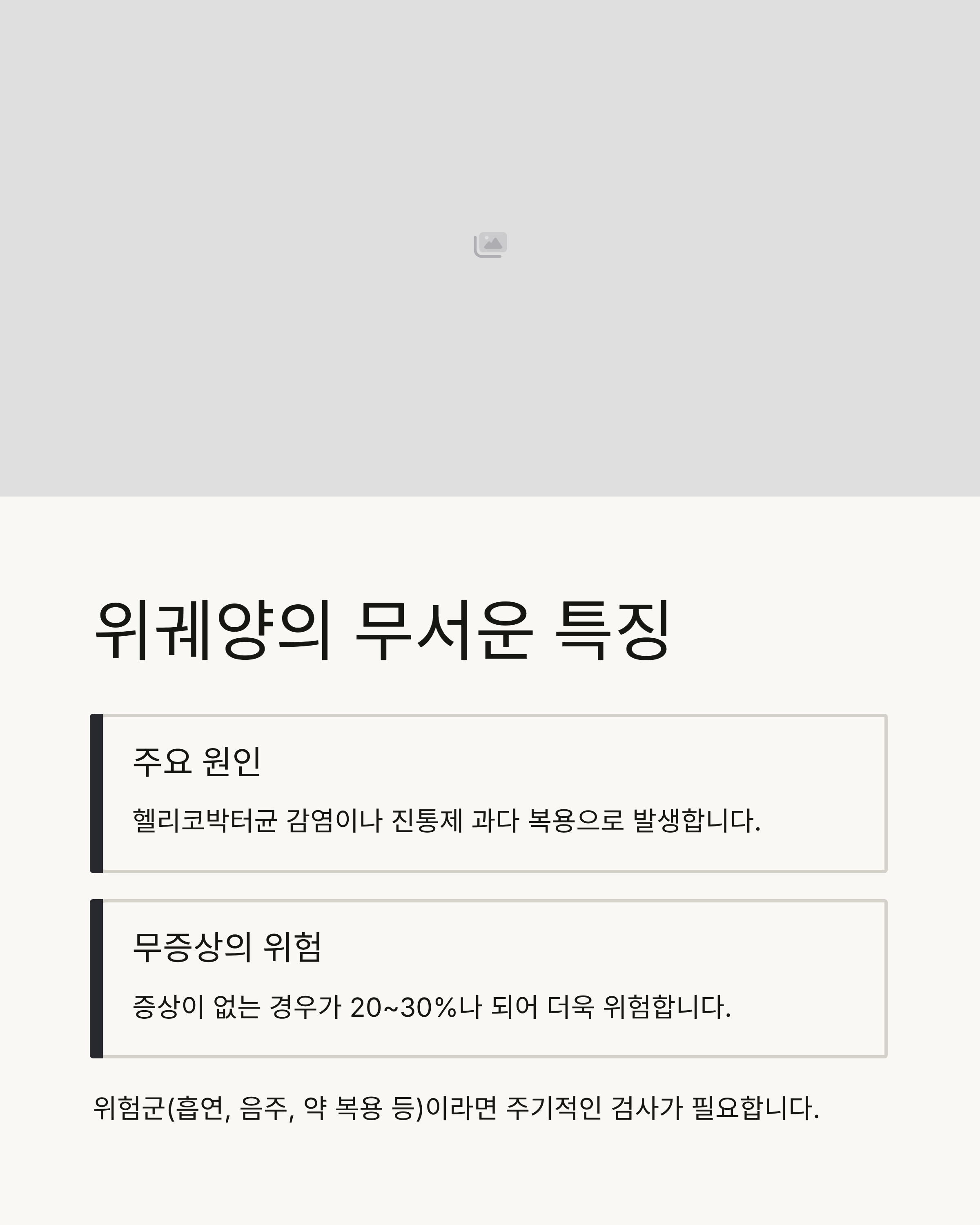 그래서 무증상이라도 위험군(흡연, 음주, 약 복용 등)이라면 주기적인 검사와 예방이 필요하죠.