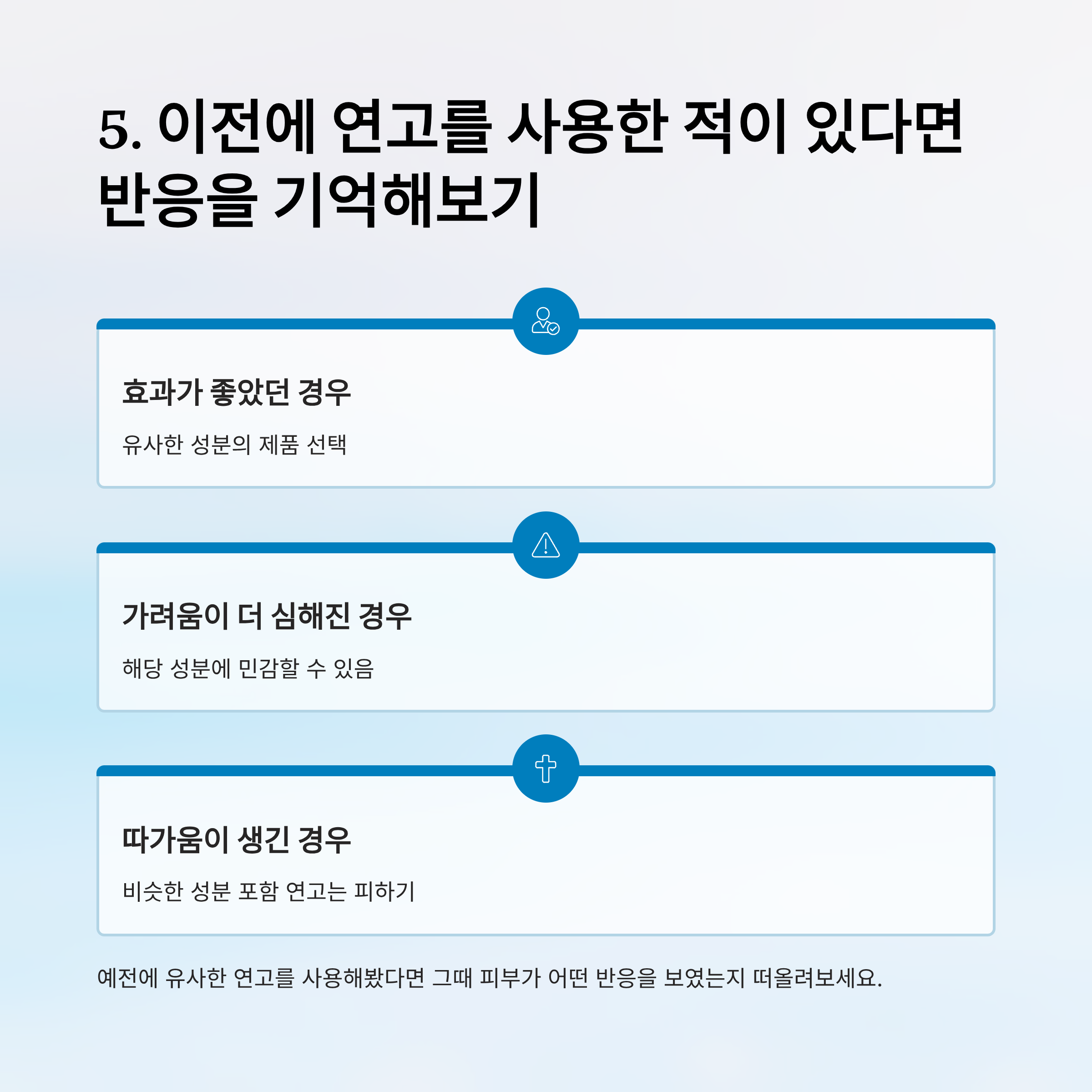 예전에 유사한 연고를 사용해봤다면 그때 피부가 어떤 반응을 보였는지 떠올려보세요.