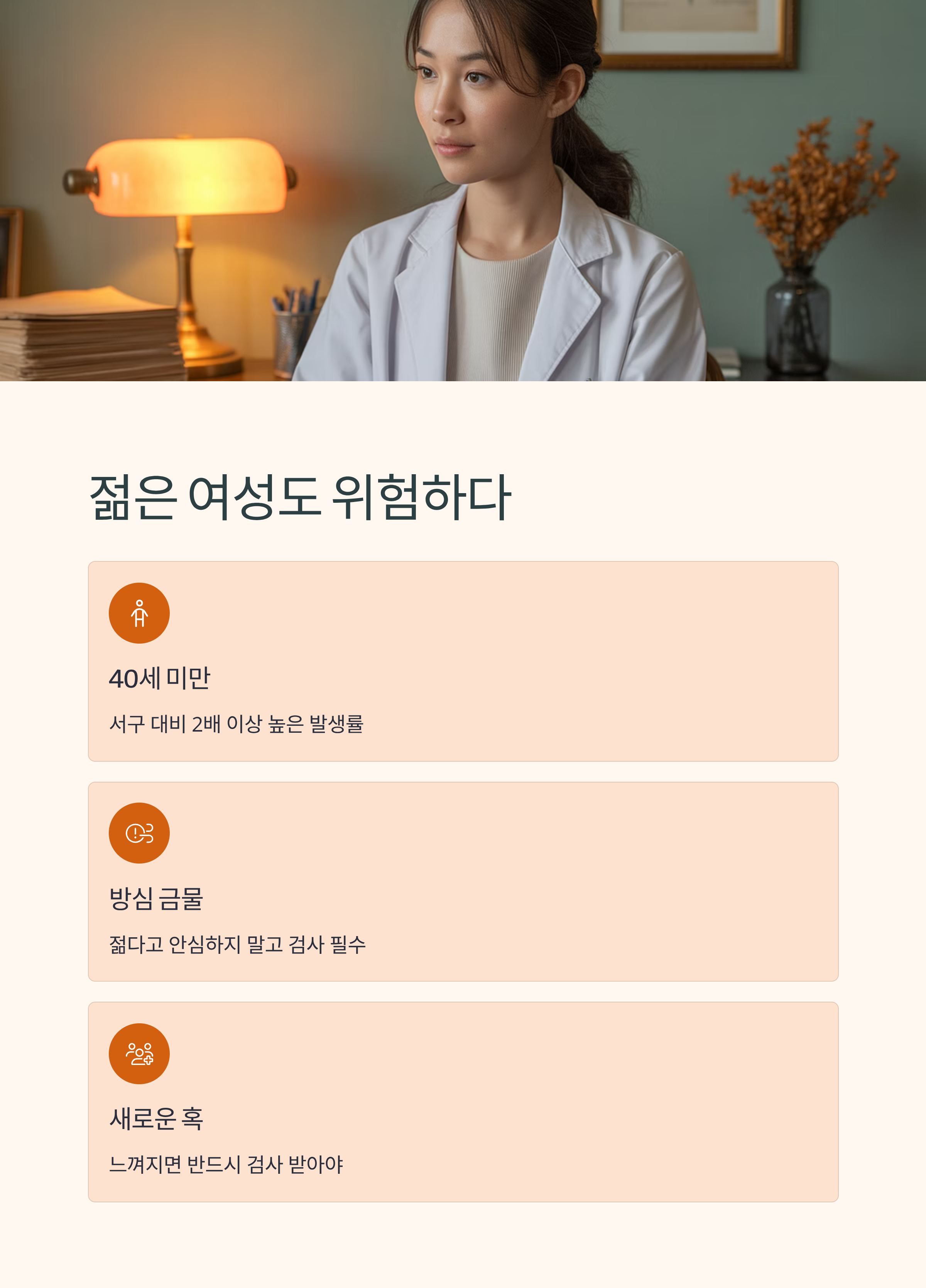 40세 미만 여성에서도 발생률이 서구에 비해 2배 이상 높게 보고되고 있습니다. 따라서 젊다고 방심하지 말고 새로운 혹이 느껴지면 반드시 검사를 받아야 합니다.