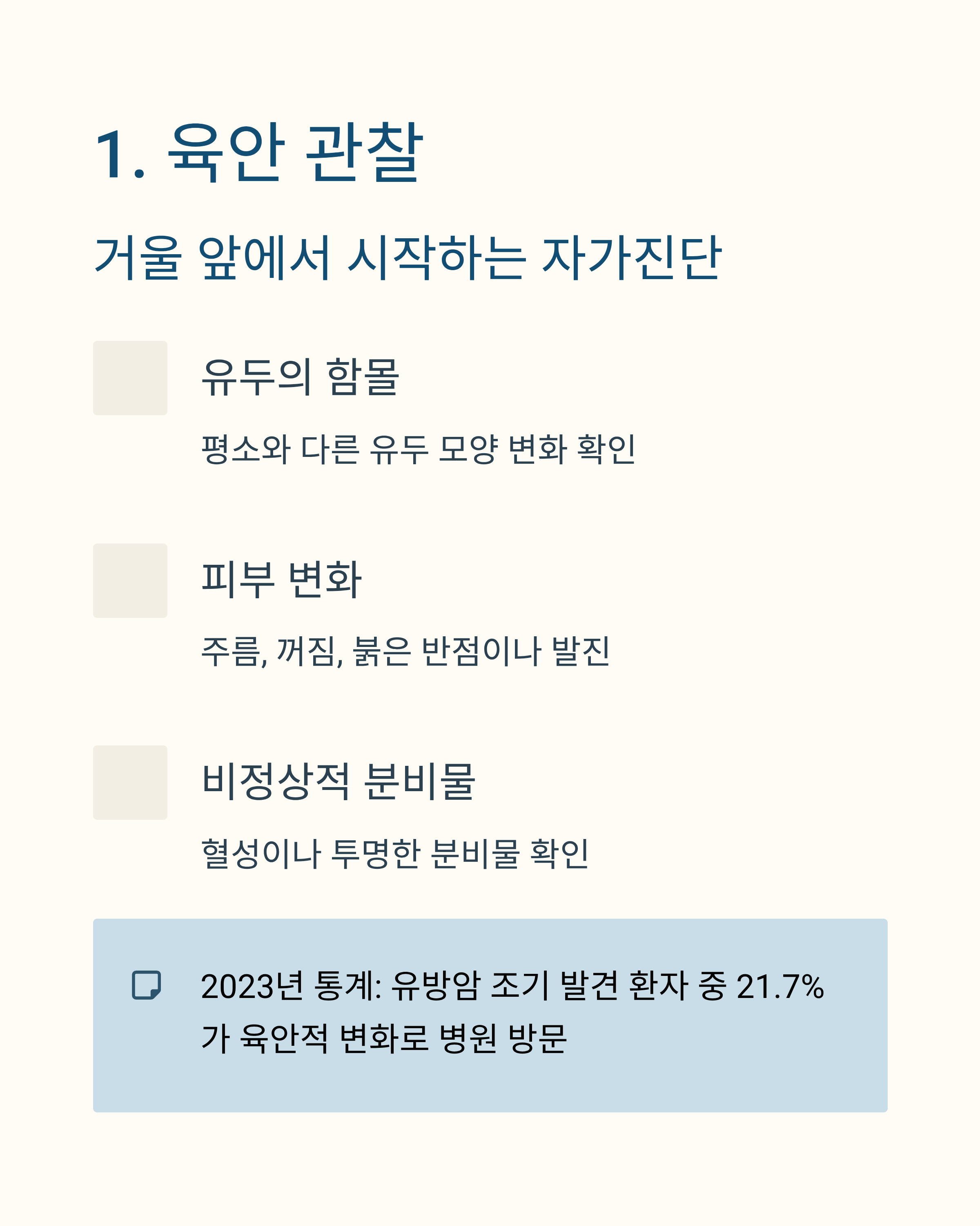 2023년 통계에 따르면, 유방암 조기 발견 환자 중 21.7%가 이러한 육안적 변화로 병원을 방문했다고 합니다. 초기 증상을 눈으로 발견하는 것, 생각보다 꽤 중요합니다.