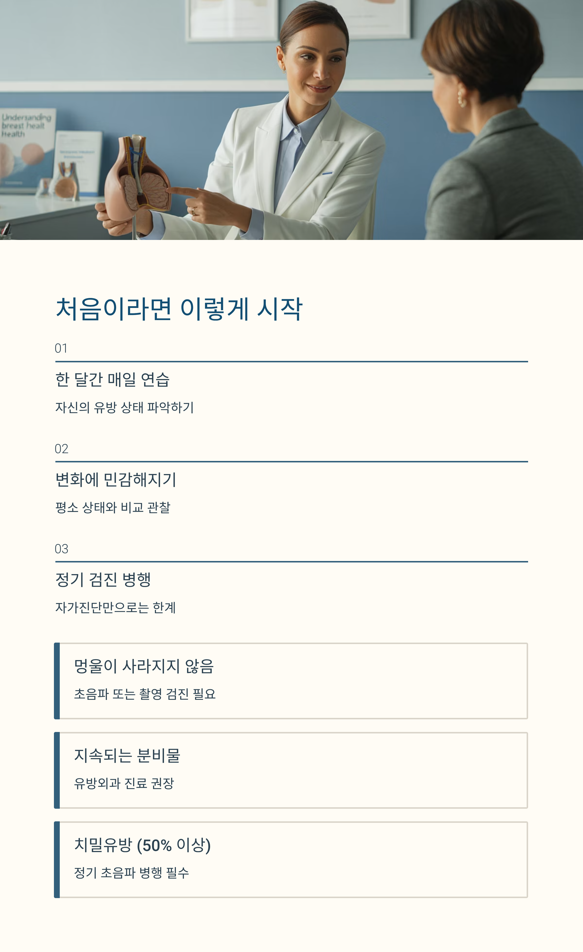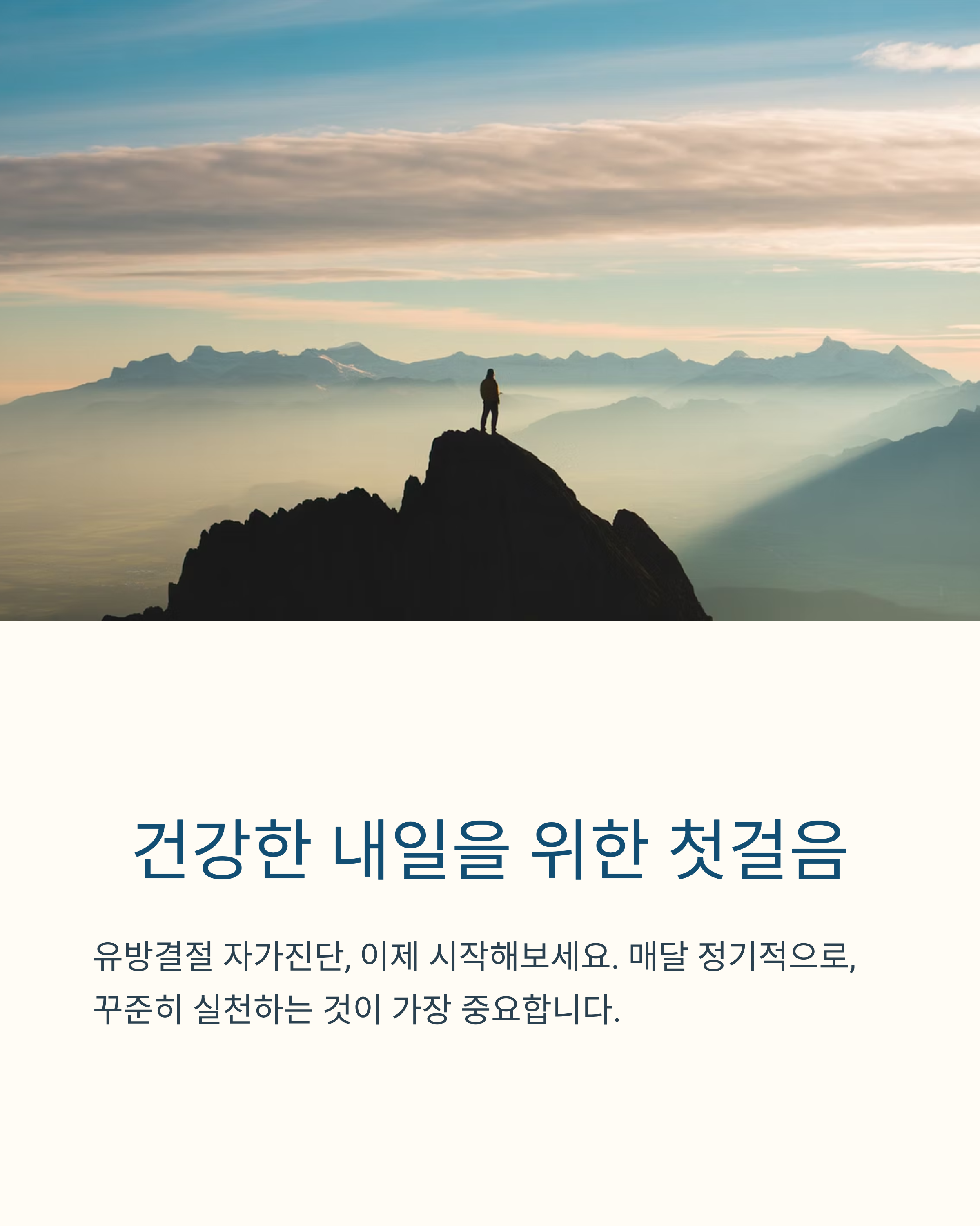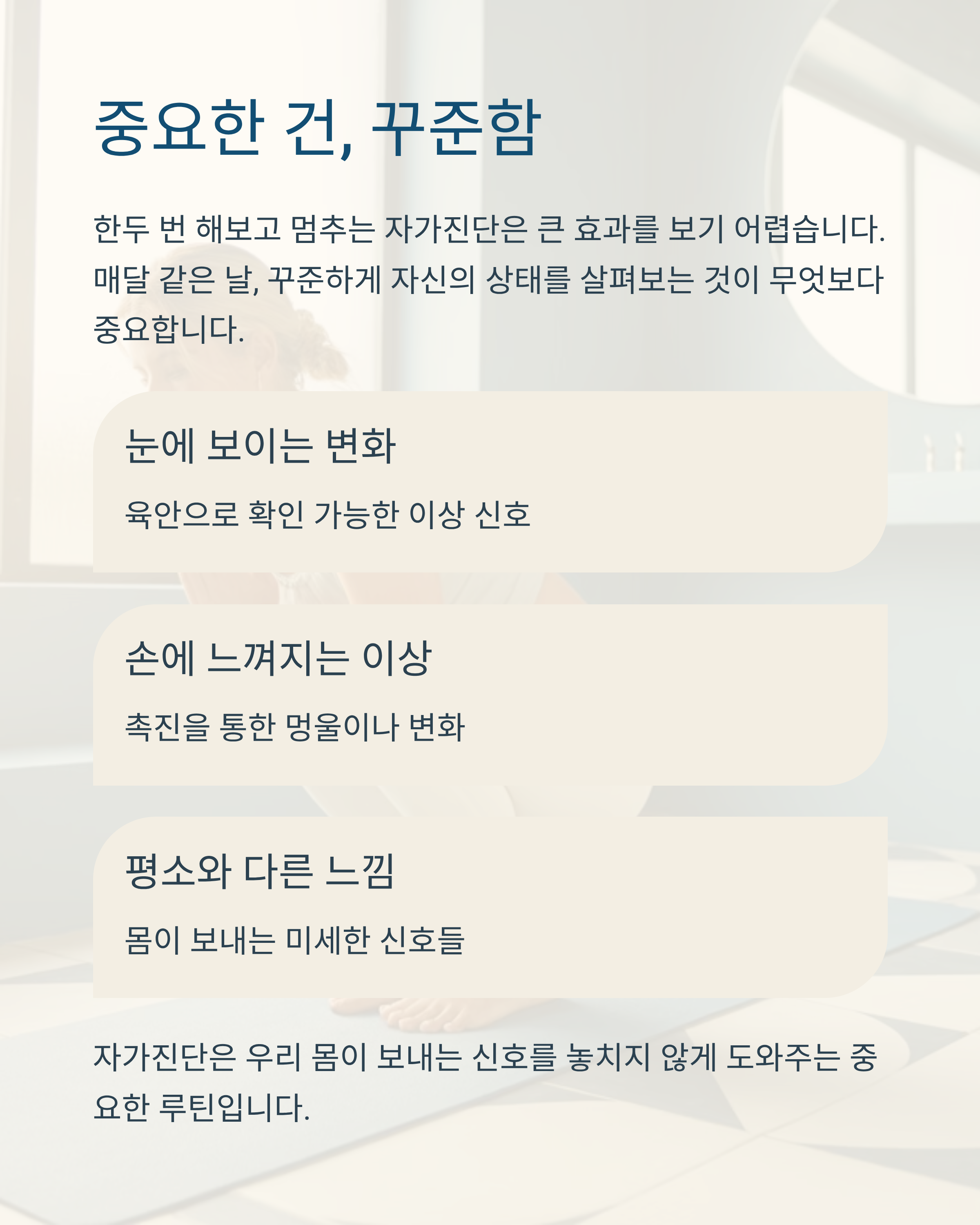 한두 번 해보고 멈추는 자가진단은 큰 효과를 보기 어렵습니다. 매달 같은 날, 꾸준하게 자신의 상태를 살펴보는 것이 무엇보다 중요합니다. 눈에 보이는 변화, 손에 느껴지는 이상, 그리고 평소와 다른 느낌까지. 자가진단은 우리 몸이 보내는 신호를 놓치지 않게 도와주는 중요한 루틴입니다.