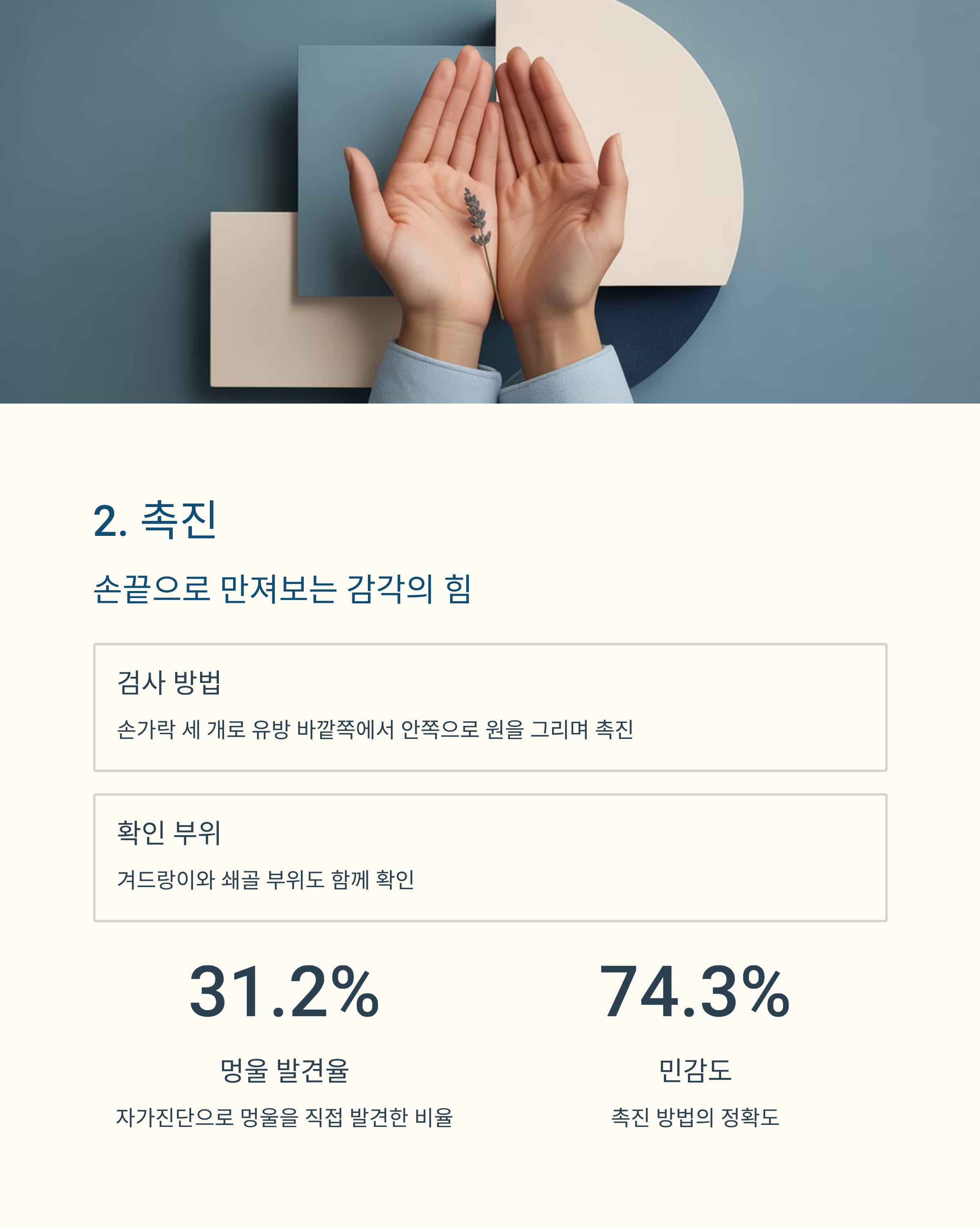 실제로 유방 자가진단을 한 사람 중 31.2%가 멍울을 직접 발견했다고 하며, 이 방법의 민감도는 약 74.3%, 특이도는 78%로 보고되고 있습니다.