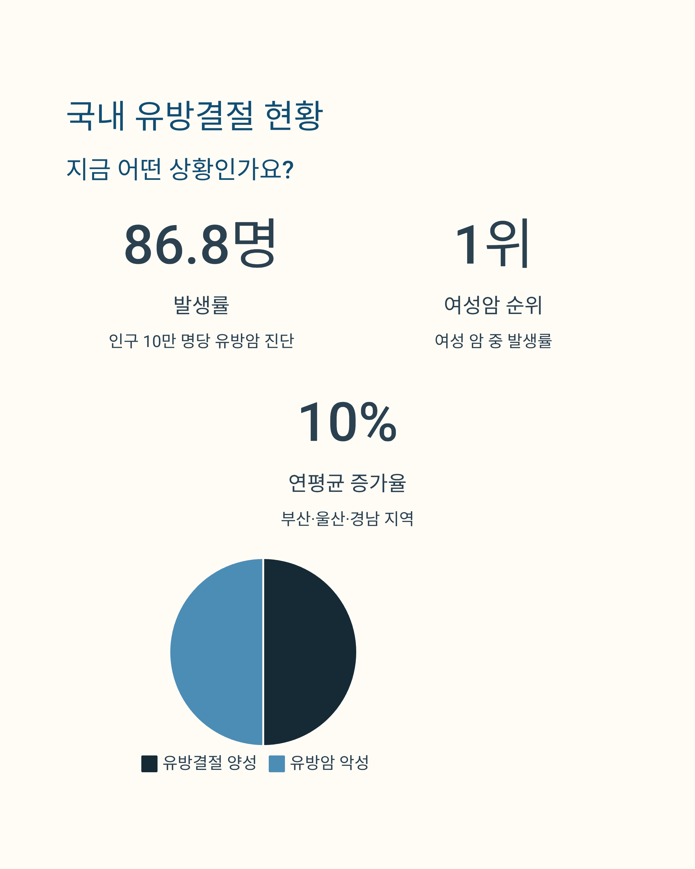 부산, 울산, 경남 지역은 특히 2021~2024년 사이 유방암 발생률이 연평균 10%씩 증가하고 있는 상황입니다. 자가진단의 필요성이 더 강조될 수밖에 없는 이유죠.