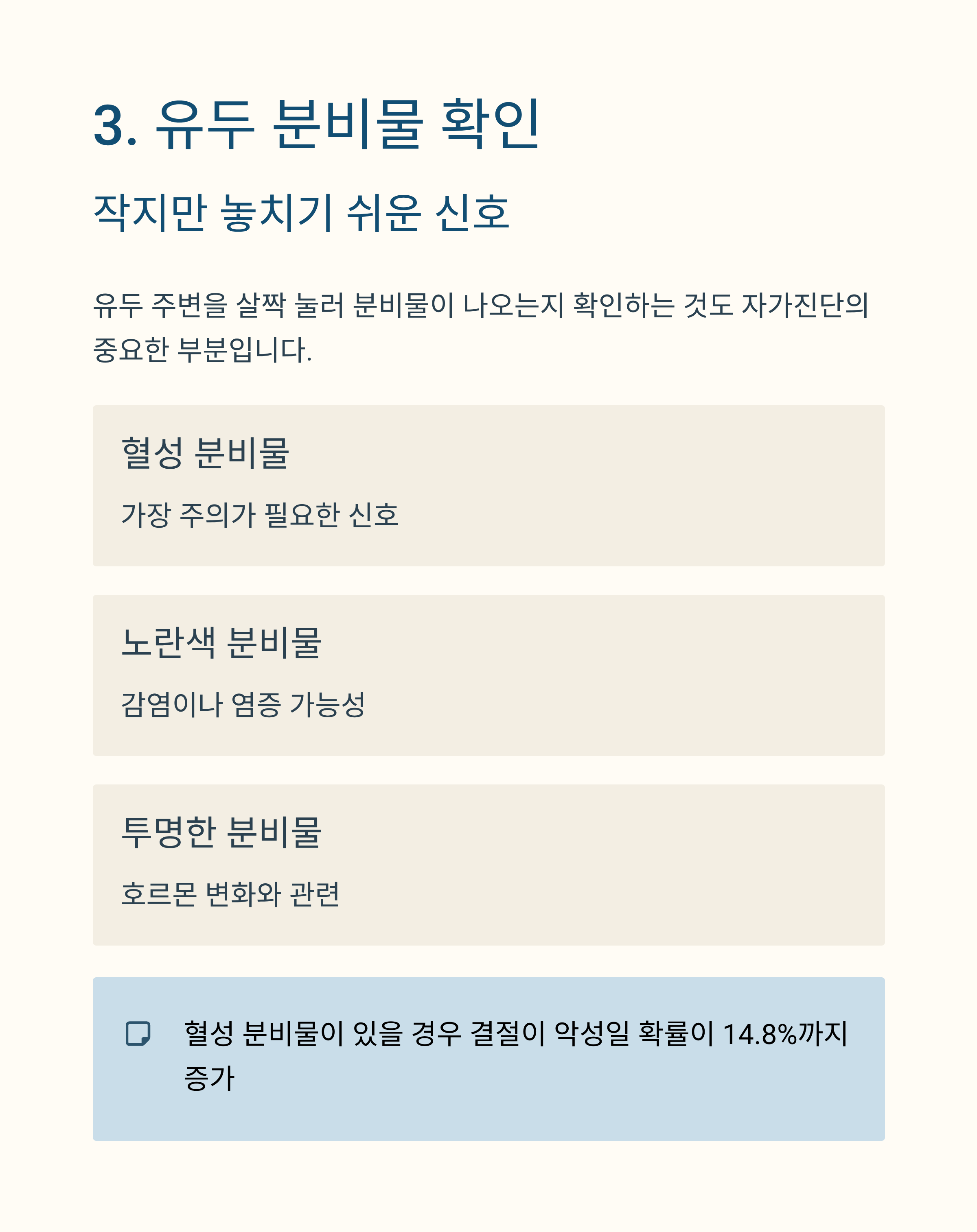 유두 주변을 살짝 눌러 분비물이 나오는지 확인하는 것도 자가진단의 중요한 부분입니다. 특히 혈성, 노란색, 또는 투명한 분비물은 주의가 필요합니다.