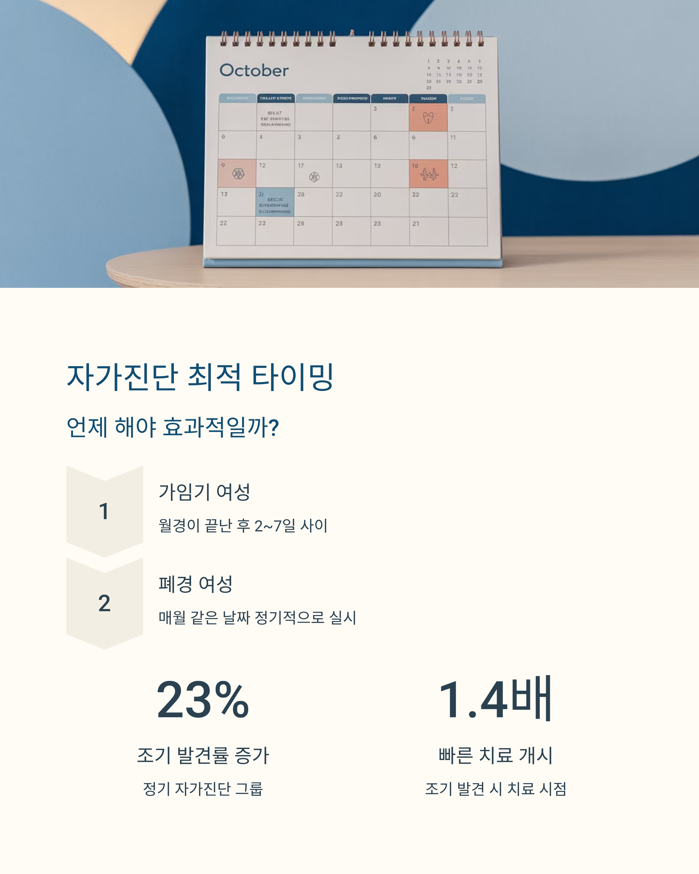자가진단을 정기 습관으로 만든 그룹은 유방암 조기 발견률이 23% 더 높았고, 치료 개시 시점도 1.4배 빨랐다는 해외 연구도 있습니다. 정기적인 자가진단, 절대 가볍게 볼 수 없죠.
