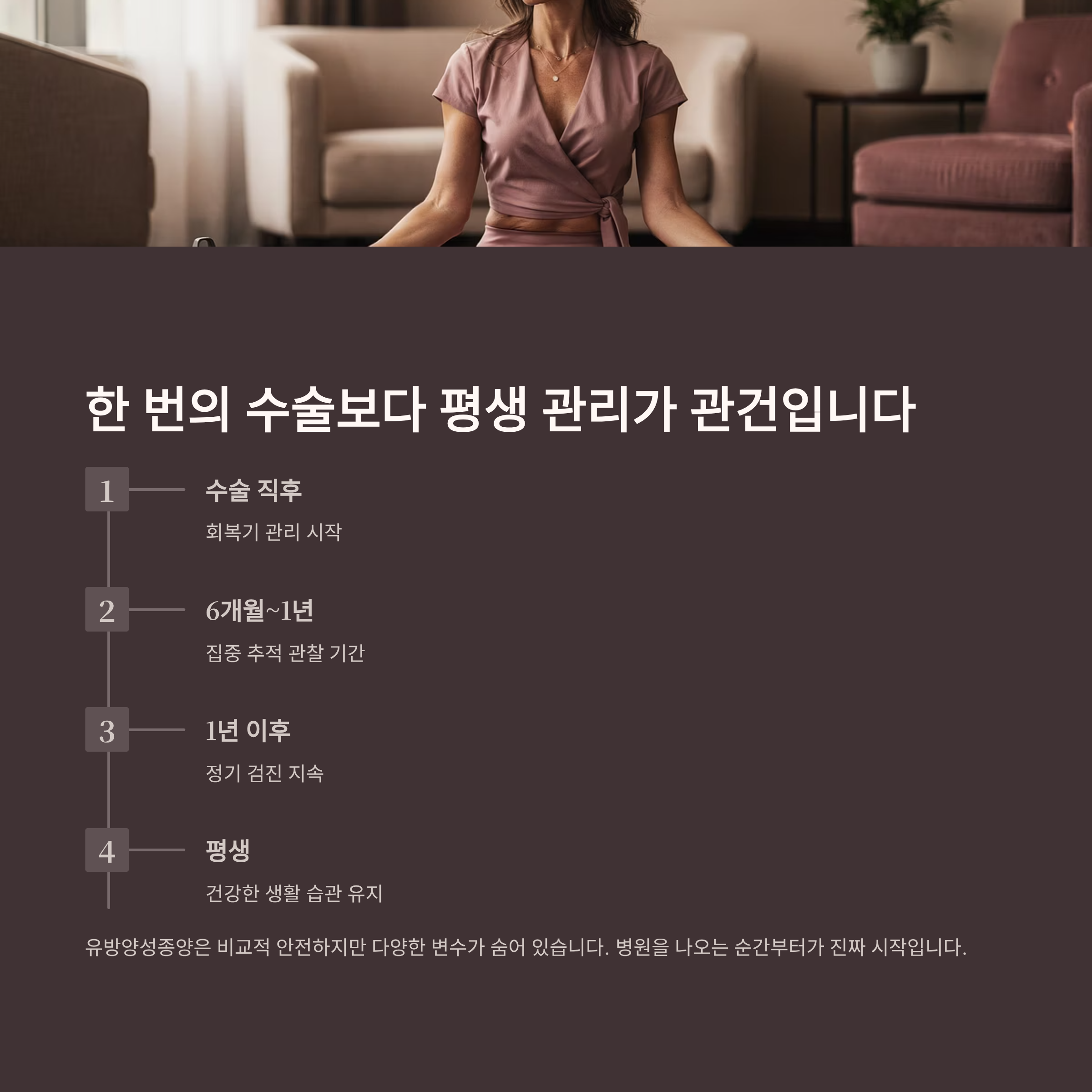 수술이 끝났다고 끝이 아닙니다. 회복기 동안 무리한 활동을 피하고, 정기적으로 유방 초음파 또는 유방촬영술을 받는 것이 중요해요. 수술 후 첫 6개월~1년 동안은 더 자주 추적 관찰을 받는 것이 일반적입니다.