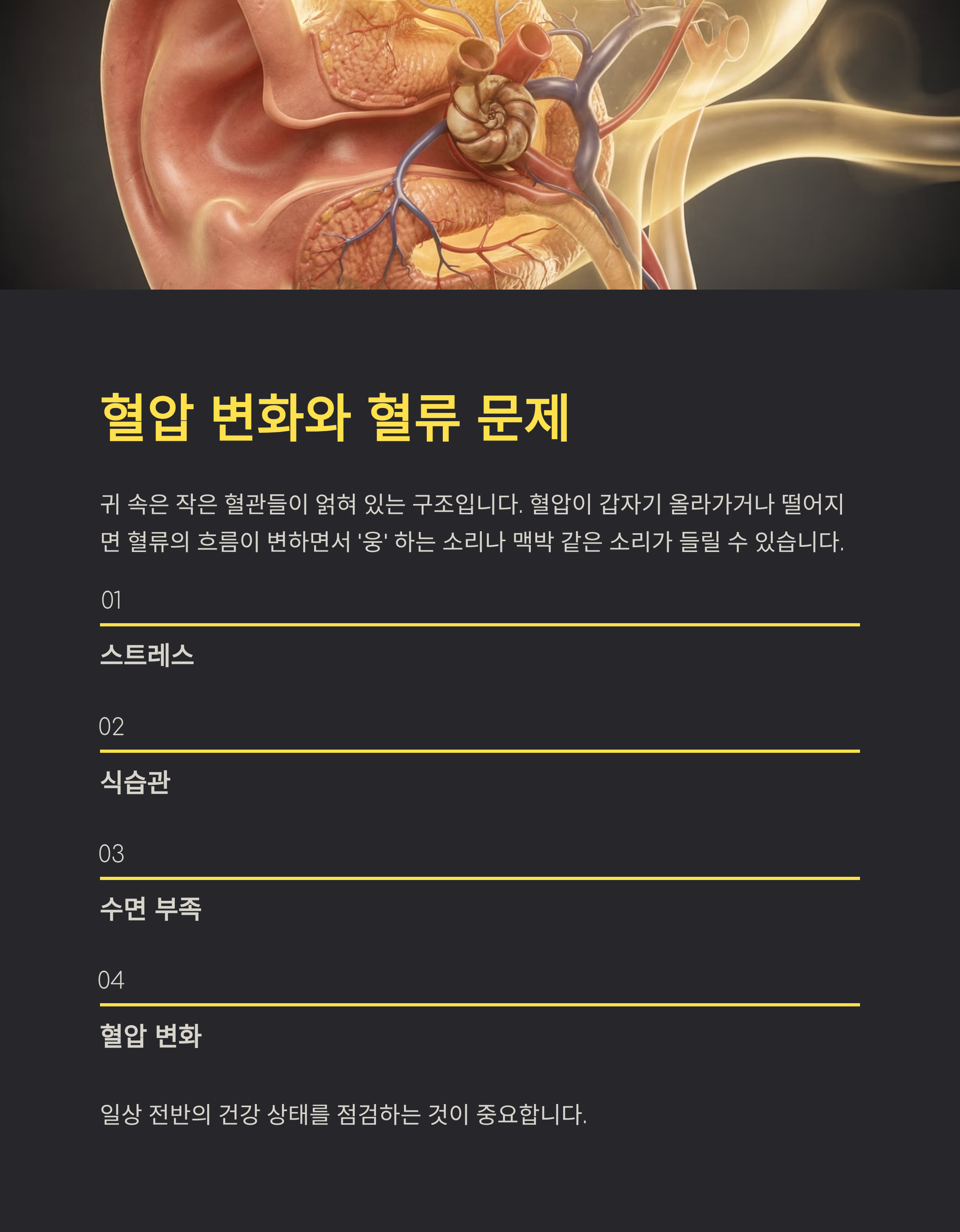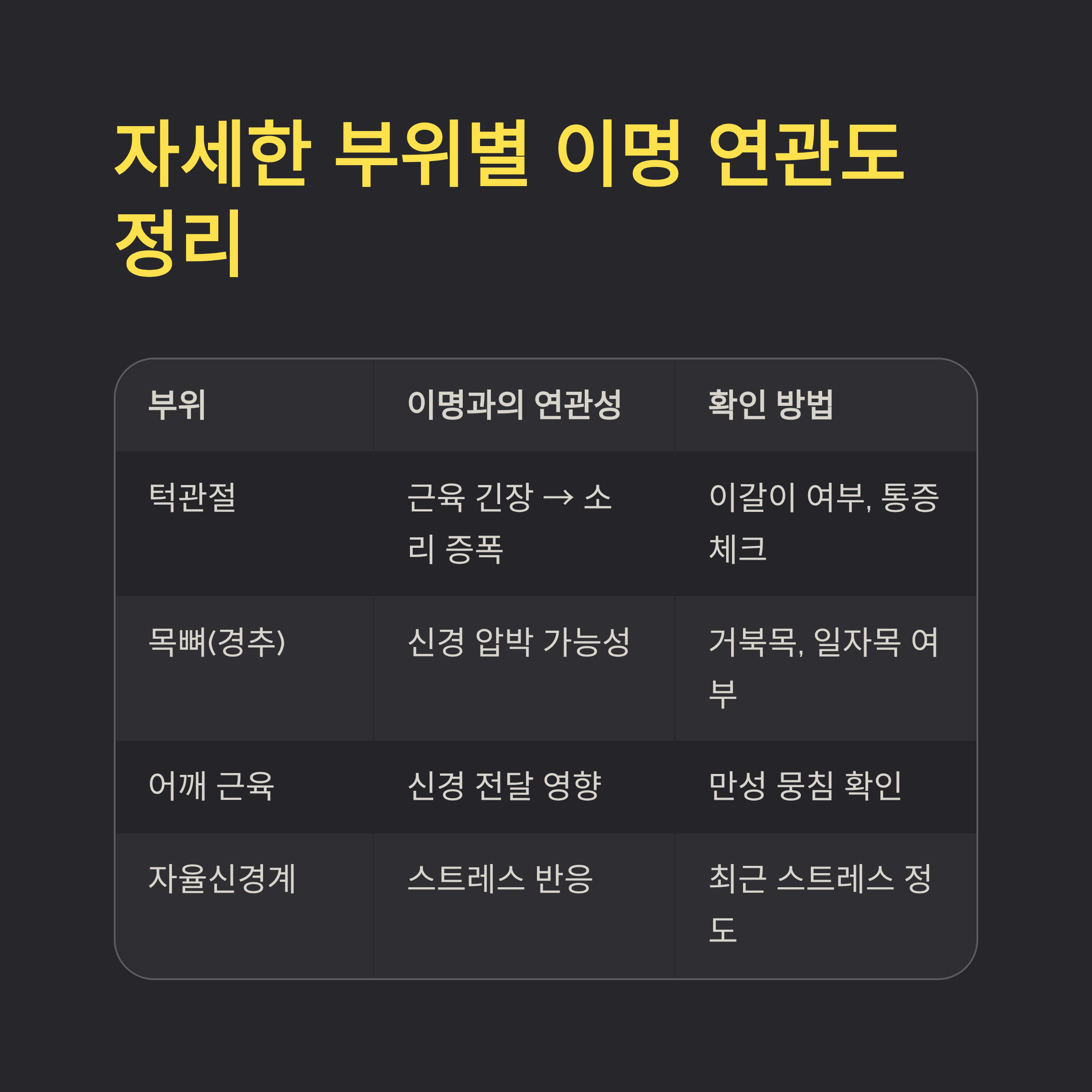 | 턱관절 | 근육 긴장 → 소리 증폭 | 이갈이 여부, 통증 체크 |
