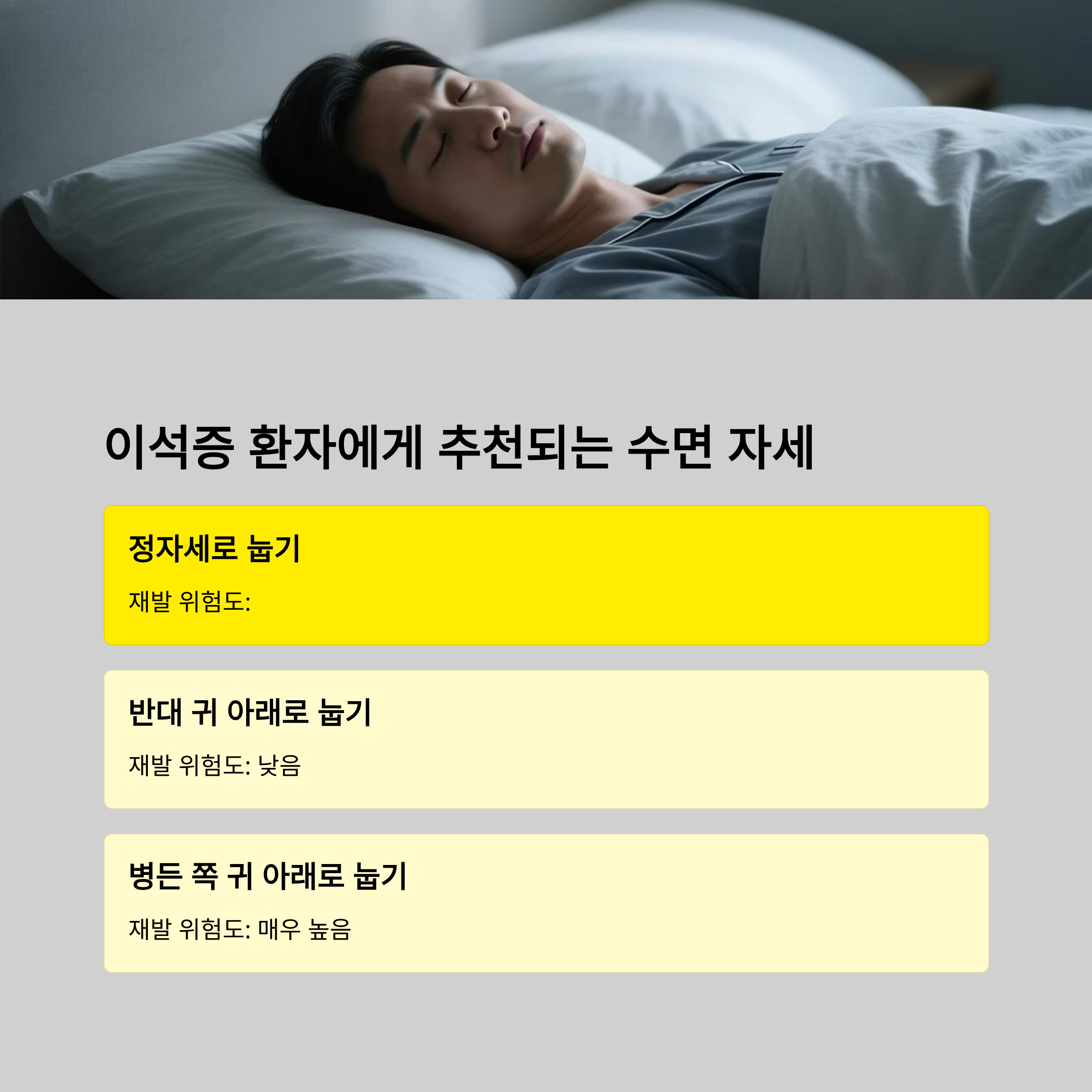 특히, 이석이 있었던 쪽 귀를 아래로 하고 자면, 중력에 의해 이석이 다시 이동할 위험이 커집니다.