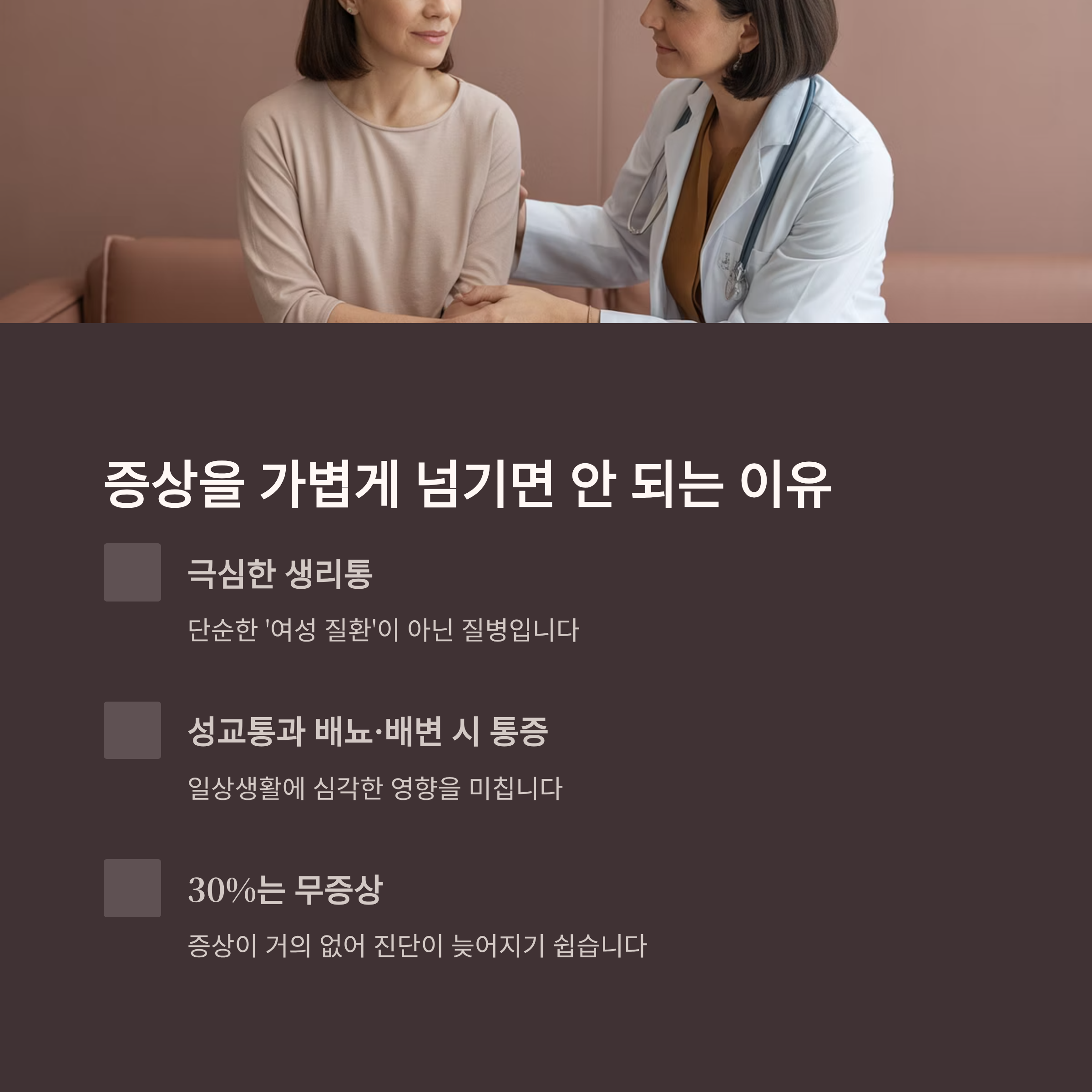 많은 여성들이 극심한 생리통이나 성교통, 배뇨·배변 시 통증을 단순한 '여성 질환'의 일부로 받아들이곤 합니다. 그러나 인지내막증은 그 자체로 질병이며, 전체 환자의 약 30%는 증상이 거의 없어 진단조차 늦어지기 쉽습니다. 특히 군대 문제나 심리적 스트레스로 오인되어 치료 시기를 놓치는 경우도 많습니다.