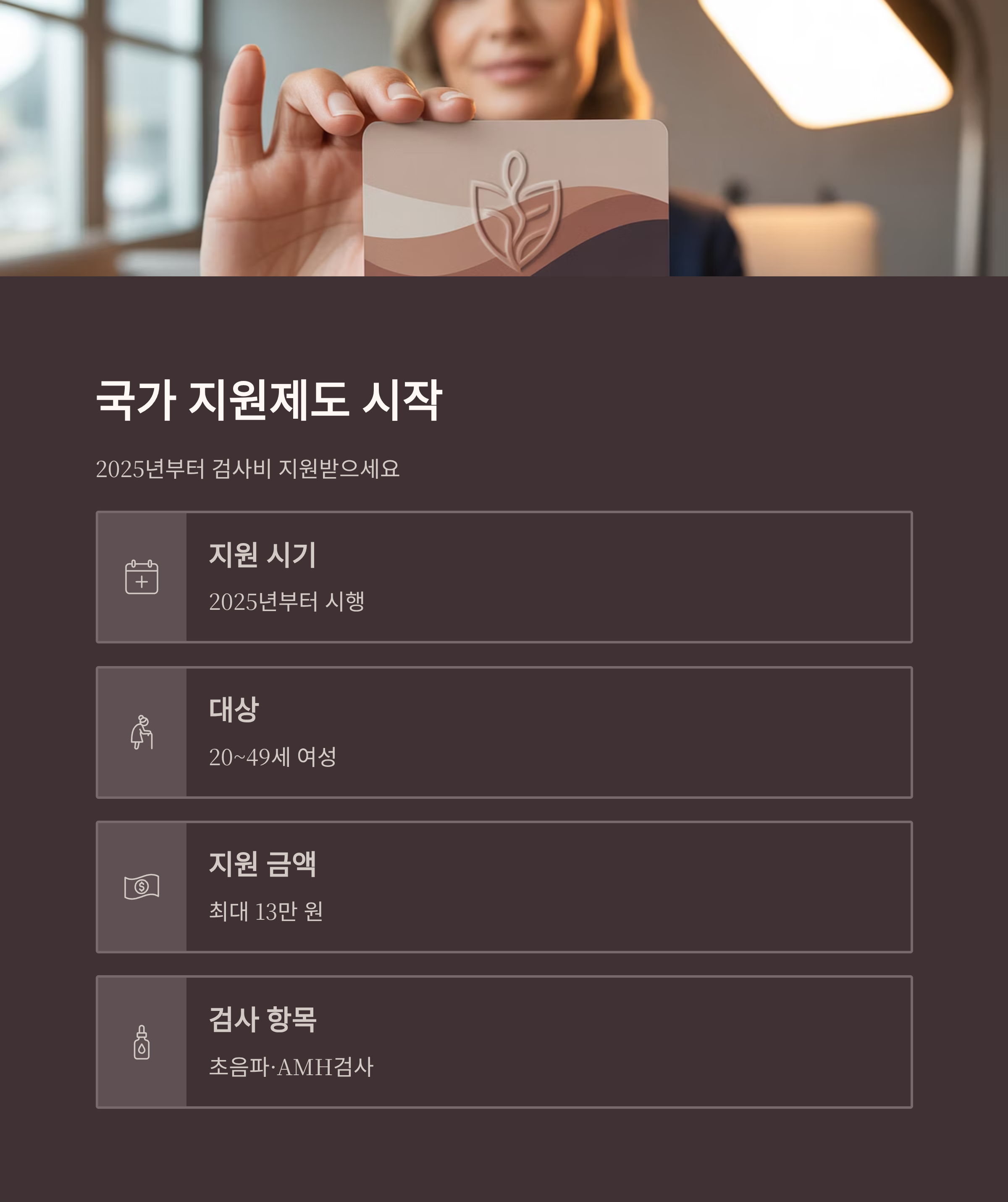 지원 제도 초음파·AMH검사 최대 13만 원 국가 지원 (2025년 시행)