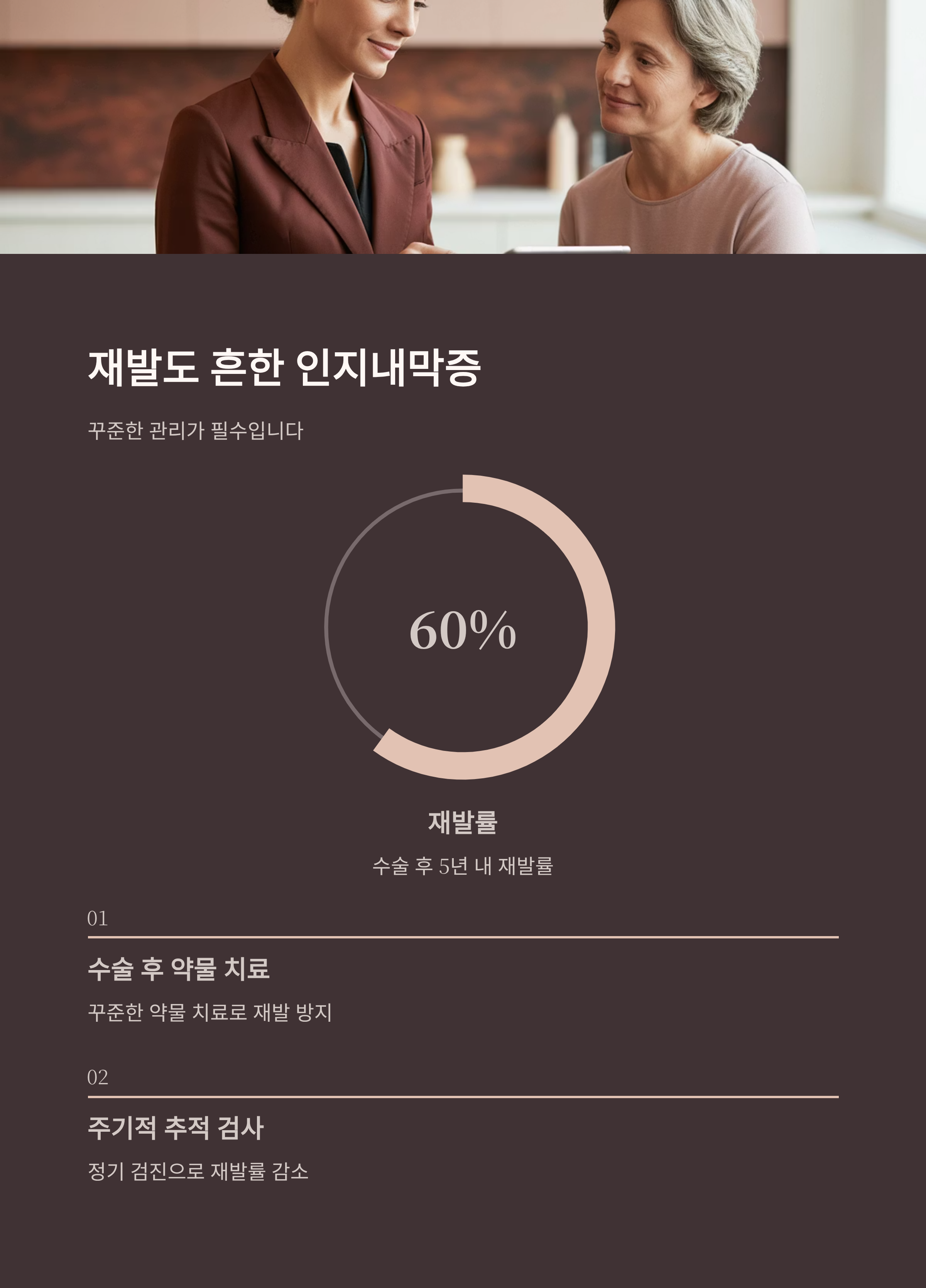 문제는 재발입니다. 수술 후 5년 내 재발률은 60%에 달한다고 합니다. 전문가들은 수술 후에도 꾸준한 약물 치료와 주기적인 추적 검사를 통해 재발률을 낮출 수 있다고 강조합니다.