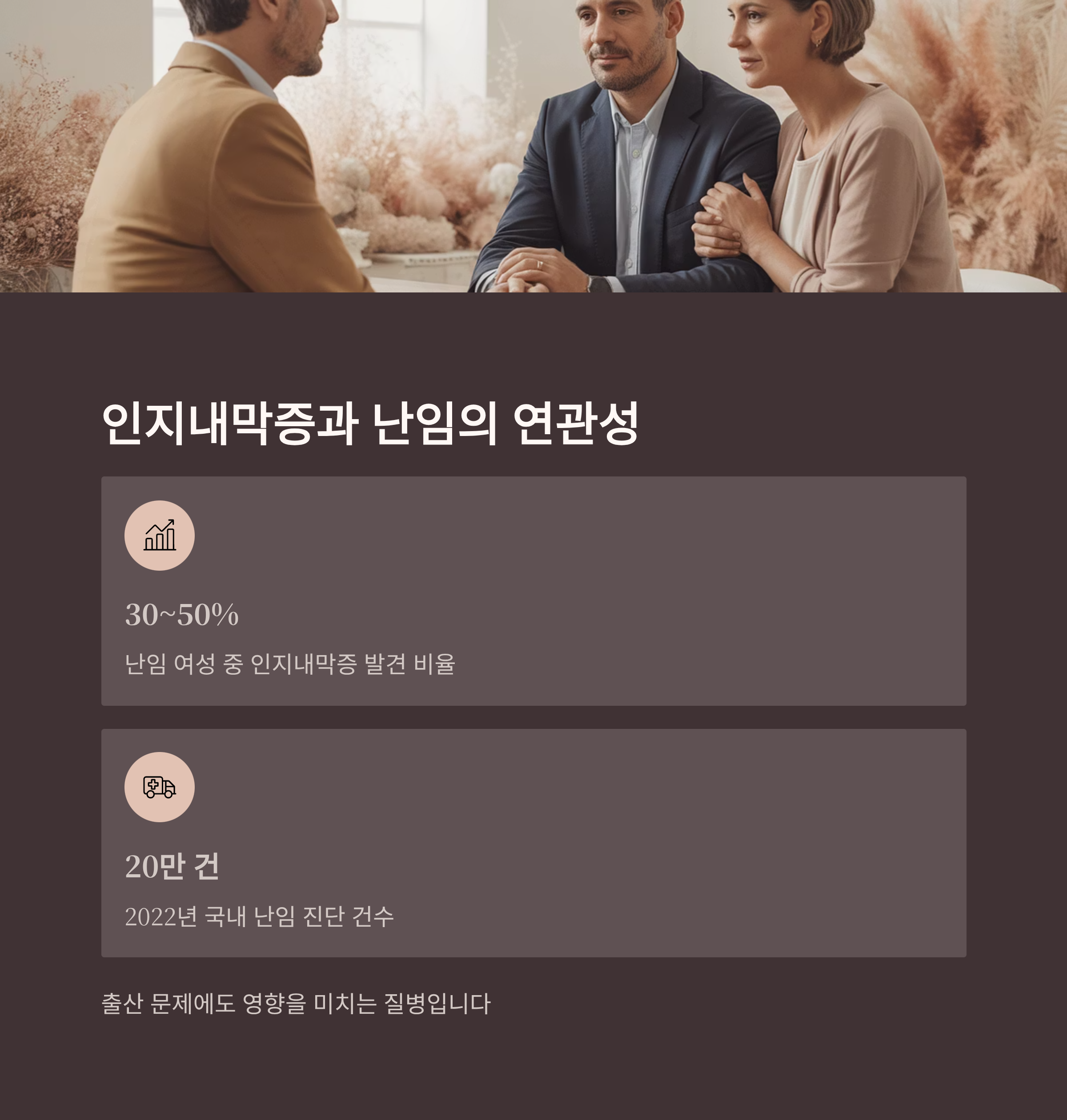난임 여성의 30~50%에서 인지내막증이 발견된다는 통계가 있습니다. 2022년 기준 국내 난임 진단 건수는 20만 건을 넘었으며, 그만큼 인지내막증은 출산 문제에도 영향을 미치는 질병입니다.