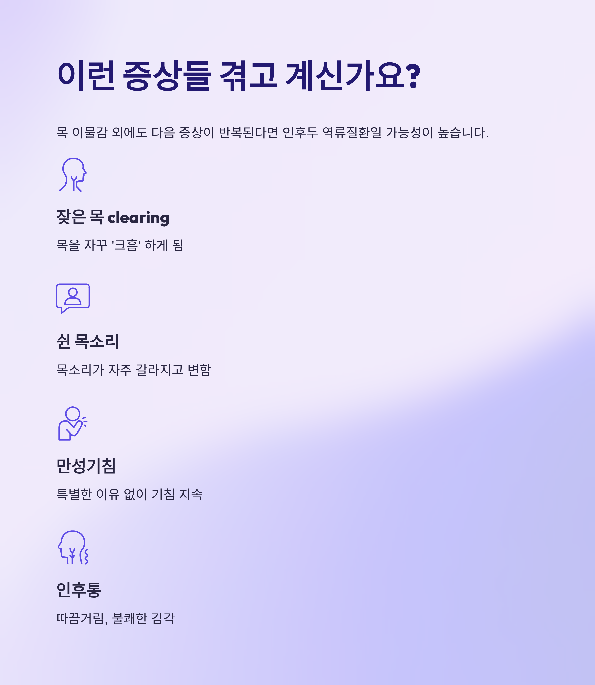 목 이물감 외에도 다음과 같은 증상이 반복된다면 인후두 역류질환일 가능성이 높습니다.