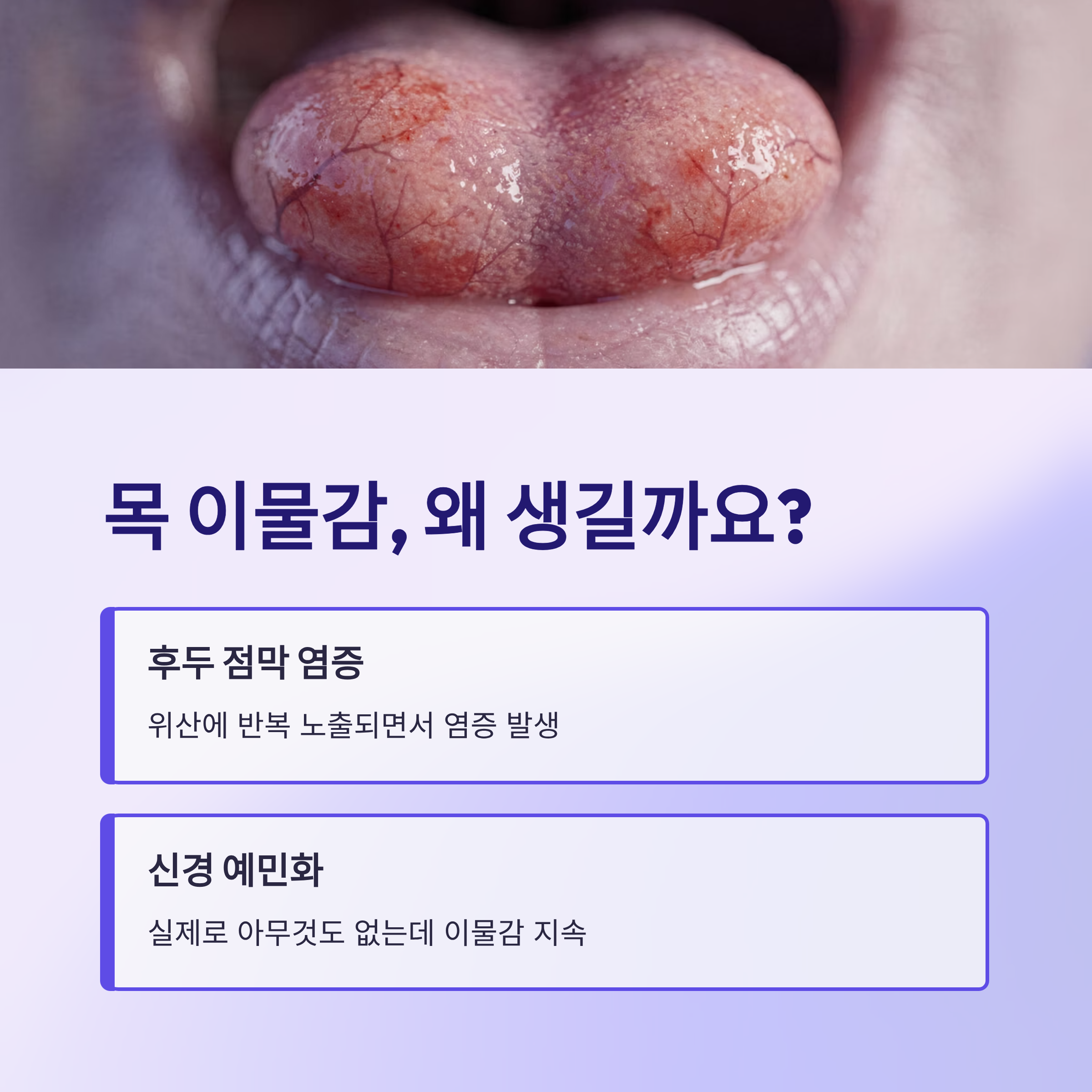 이물감의 주요 원인은 후두 점막이 위산에 반복적으로 노출되면서 염증이 생기고, 신경이 예민해지기 때문입니다.