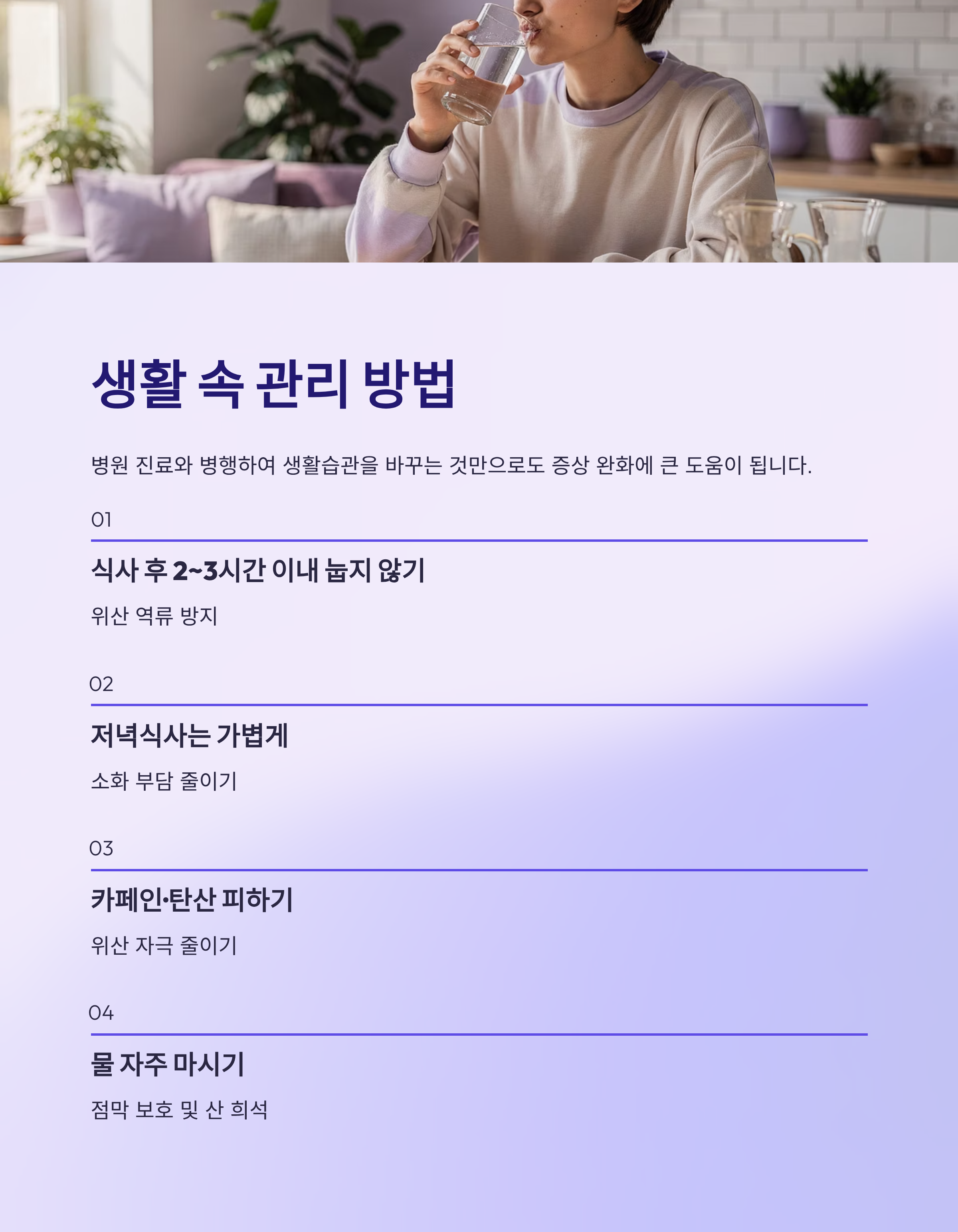 습관을 바꾸는 건 어렵지만, 조금씩 실천하면 증상 개선에 확실히 도움이 됩니다.