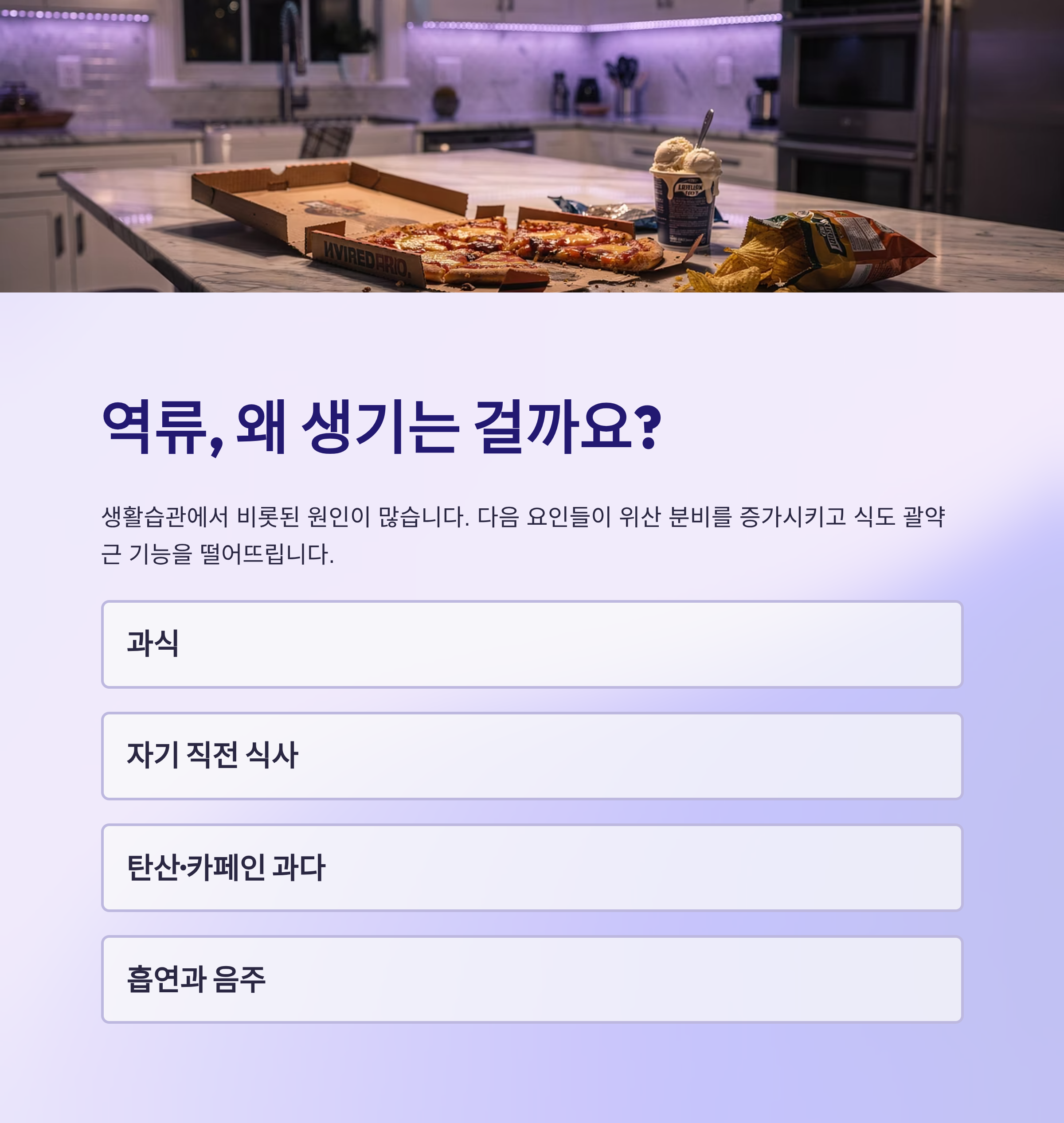 이런 습관들이 위산 분비를 증가시키고, 식도 괄약근 기능을 떨어뜨리면서 위 내용물이 쉽게 역류하게 만드는 것이죠.