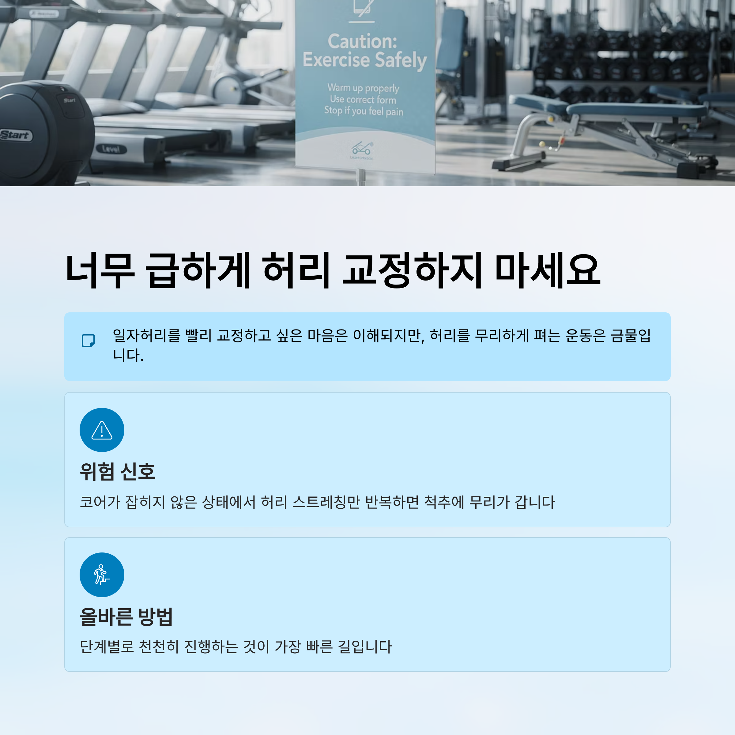 일자허리를 빨리 교정하고 싶은 마음은 이해되지만, 허리를 무리하게 펴는 운동은 금물입니다.