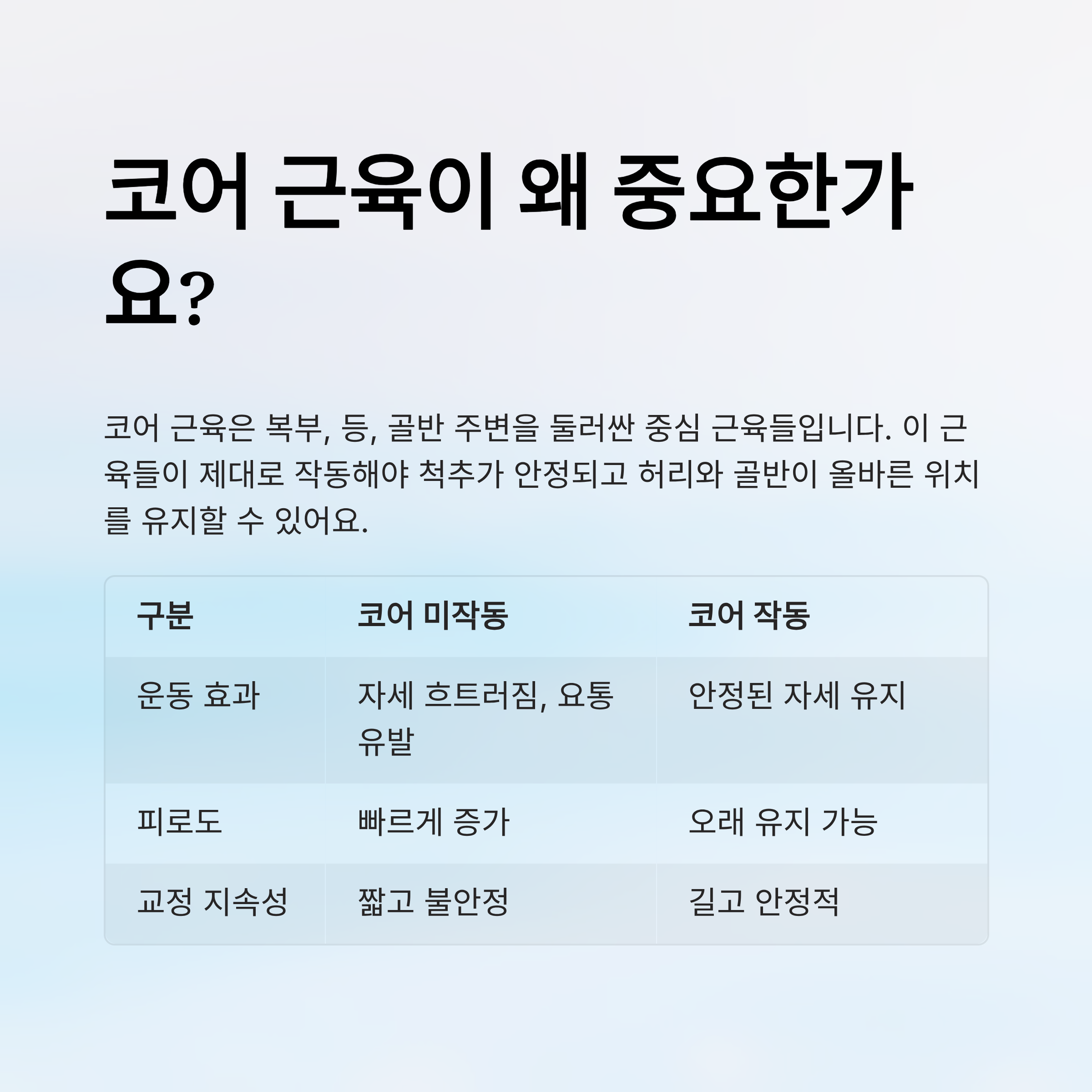 이 근육들이 제대로 작동해야 척추가 안정되고, 허리와 골반이 올바른 위치를 유지할 수 있어요.