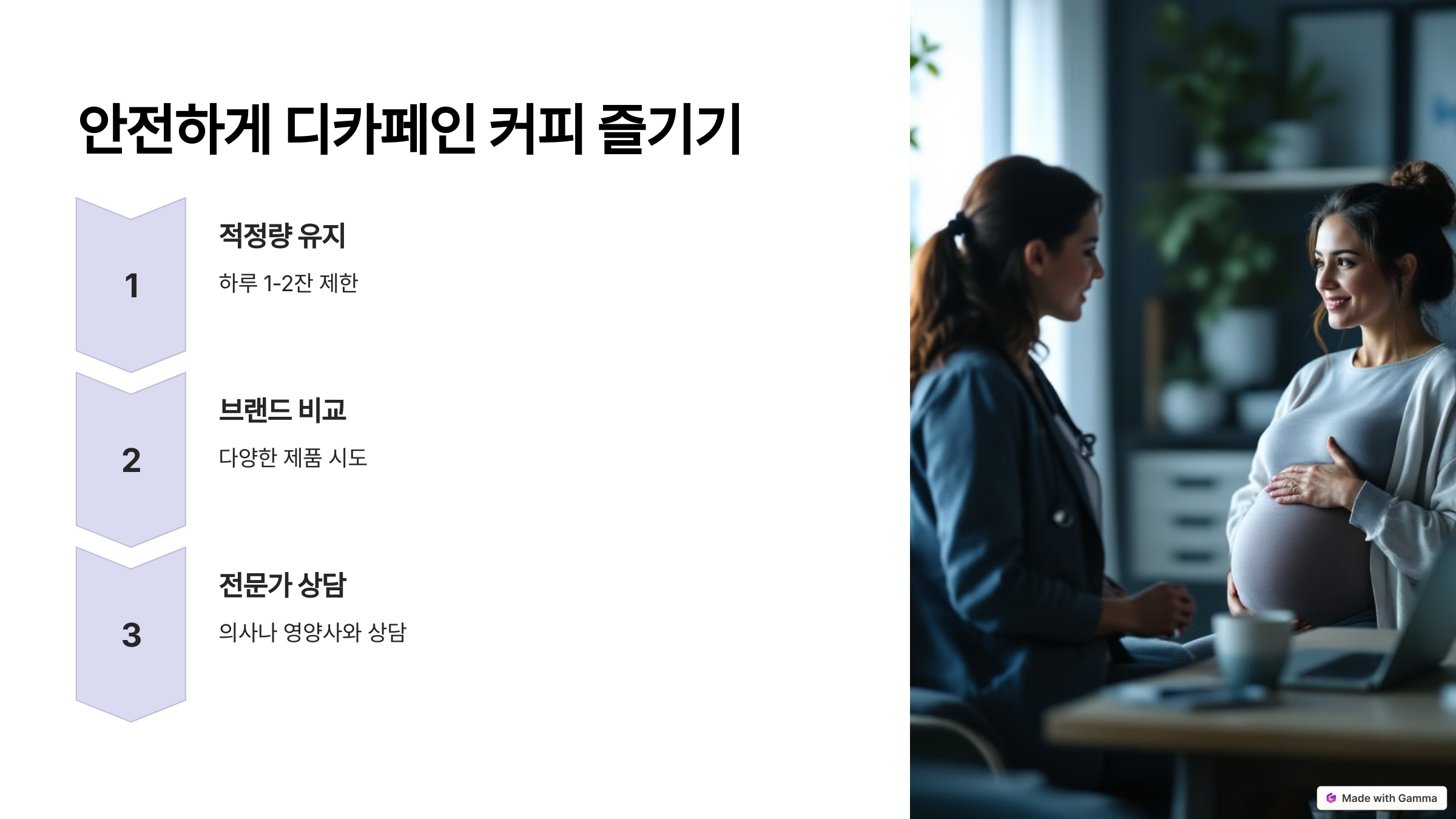 - 전문가와 상담하세요: 임신 중 커피 섭취에 대한 궁금한 점이나 걱정이 있다면, 의사나 영양사와 상담하여 개인의 건강 상태에 맞는 조언을 받는 것이 중요합니다. 전문가의 의견을 통해 안전하게 디카페인 커피를 즐길 수 있습니다.