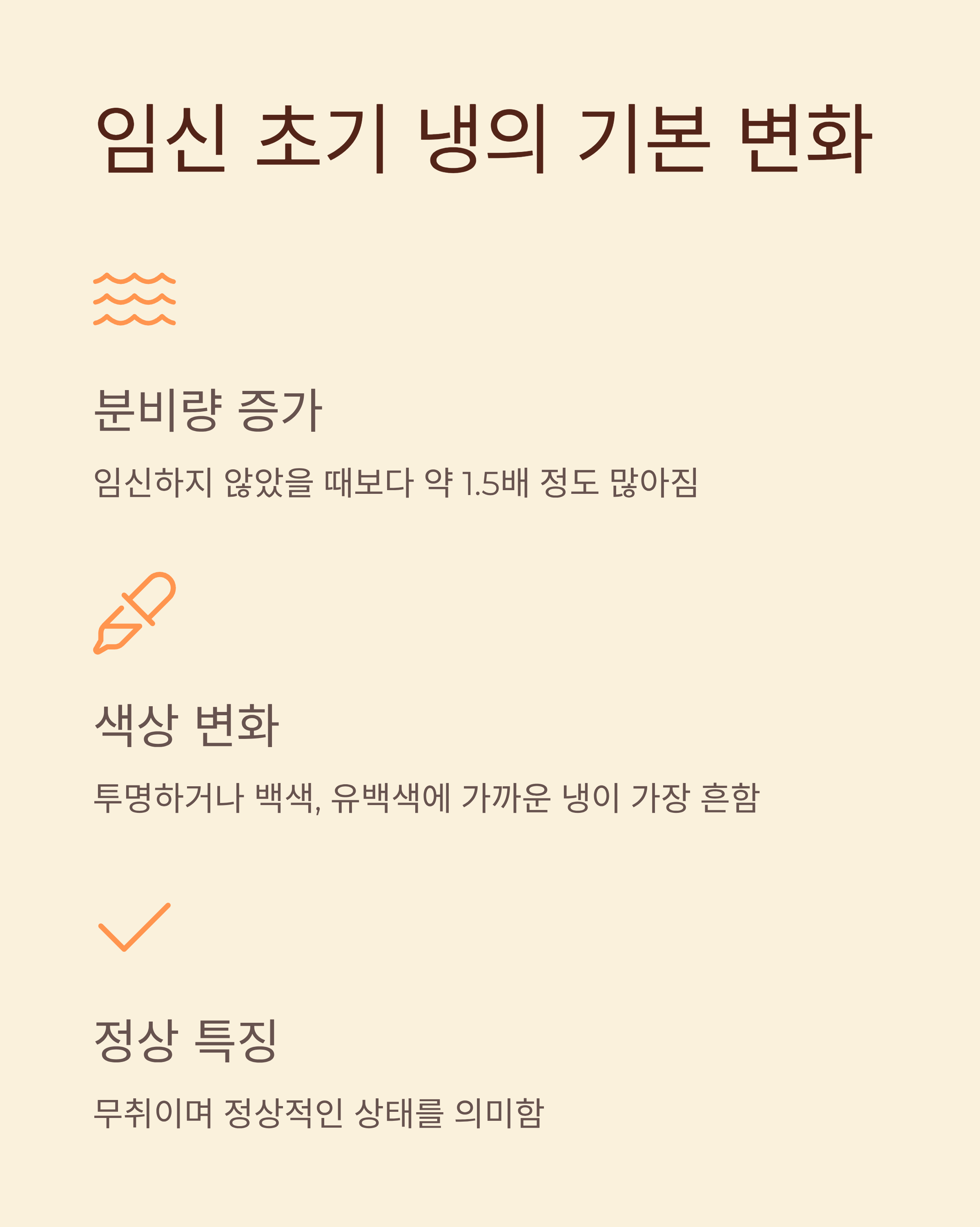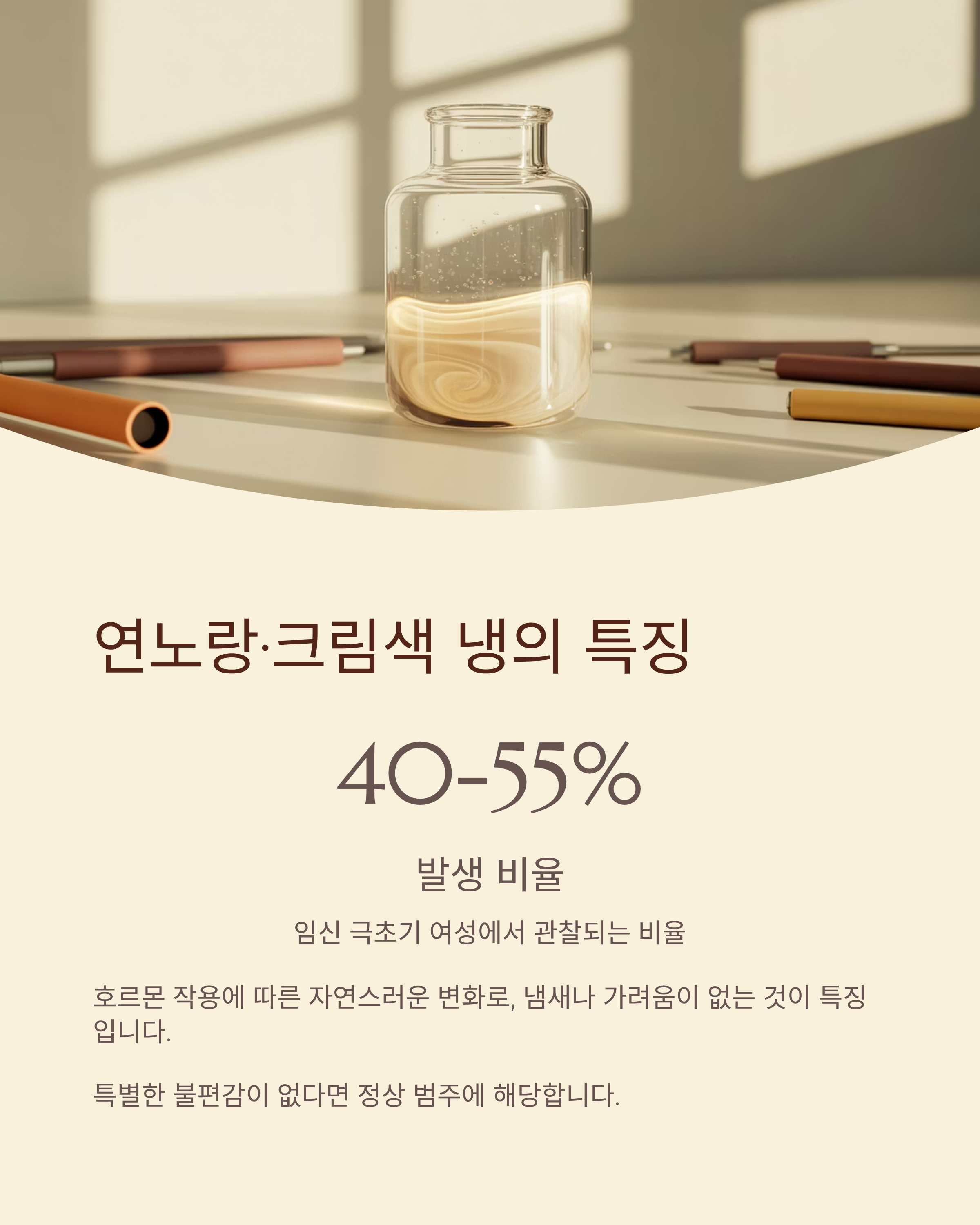 임신 극초기 여성의 약 40%~55%에서 크림색 또는 연노란색 냉이 관찰됩니다. 이는 호르몬 작용에 따른 자연스러운 변화로, 냄새나 가려움이 없는 것이 특징입니다. 특별한 불편감이 없다면 정상 범주에 해당합니다.