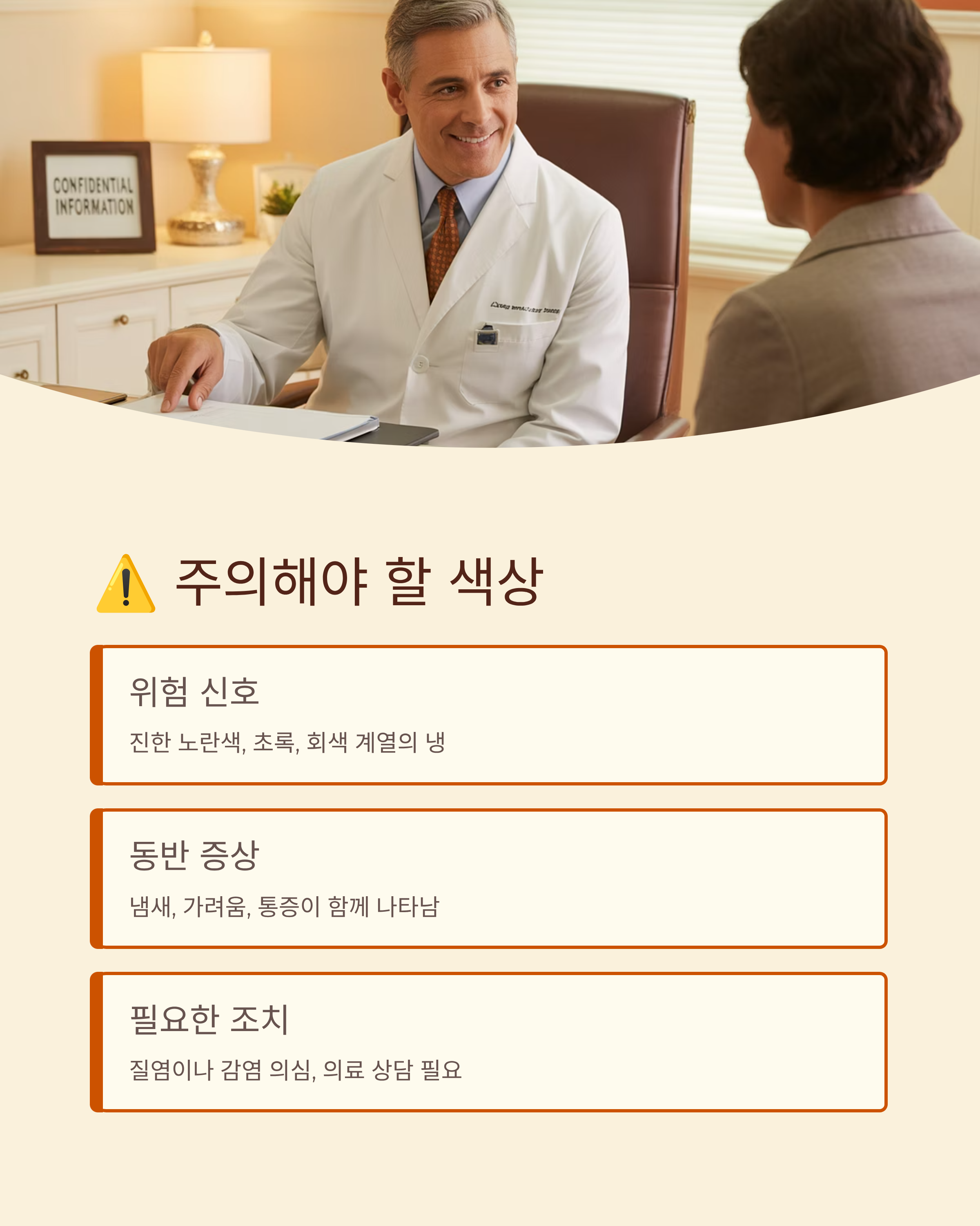 투명·백색 × 60%~80% 정상, 무취, 흔히 관찰