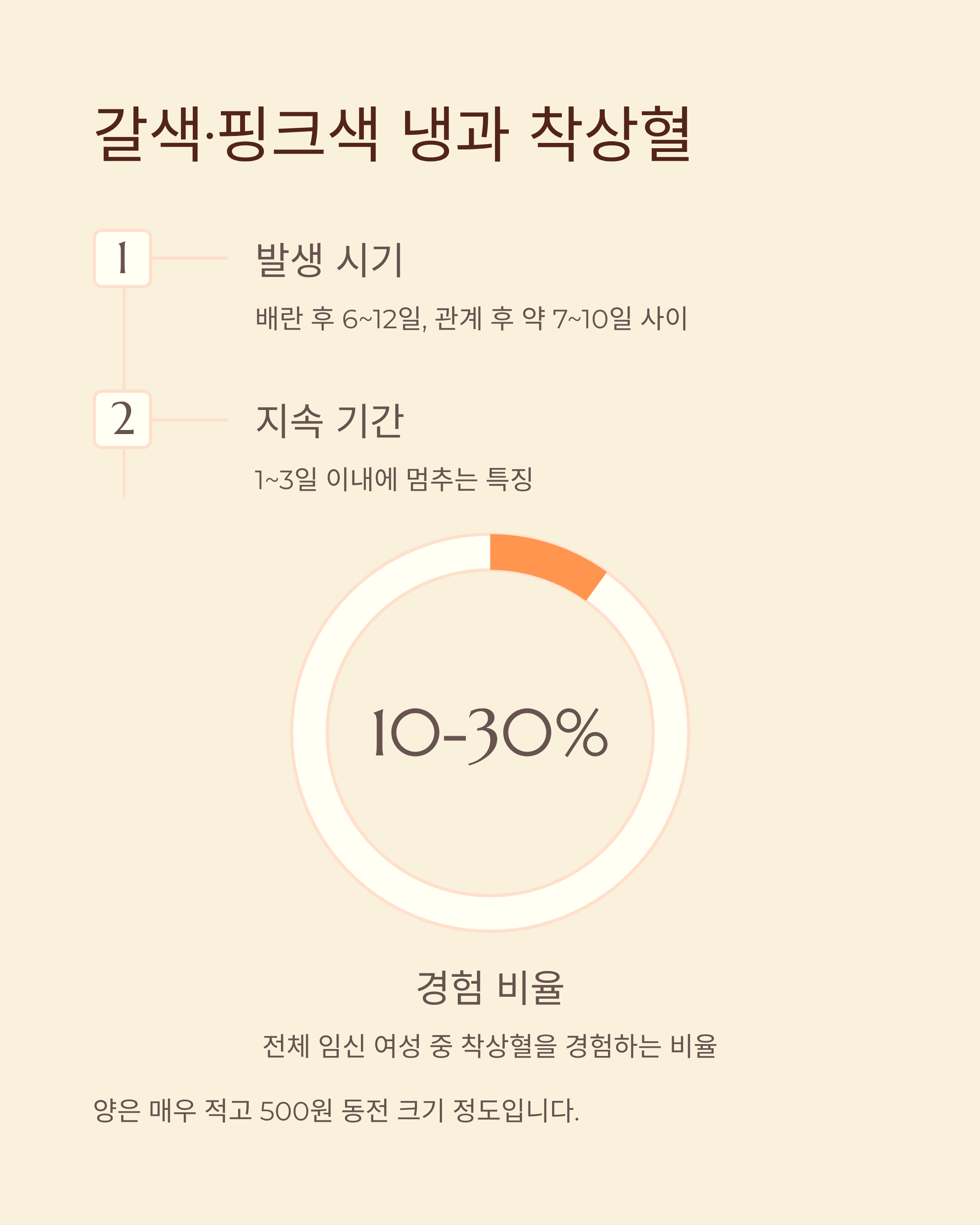 | 갈색·핑크색 | △ | ○ | 10%~30% | 착상혈 가능, 1일~3일 지속 |
