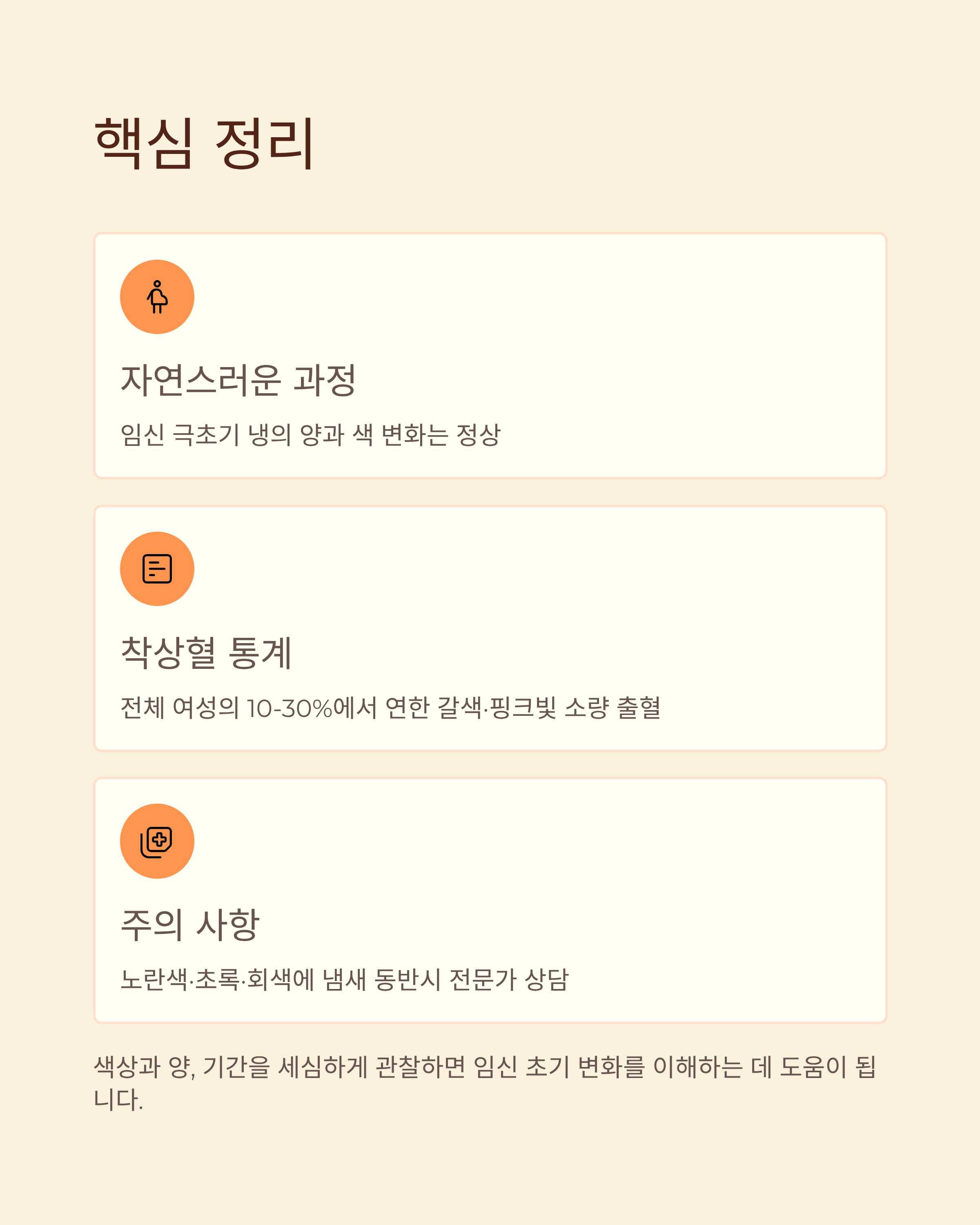 임신 극초기에는 냉의 양이 늘고 색이 변하는 것이 자연스러운 과정입니다. 전체 여성의 10~30%에서 착상혈이 나타나며, 색은 연한 갈색이나 핑크빛이 많고 양은 매우 적습니다. 반대로 노란색·초록·회색 계열에 냄새가 동반되면 질환 가능성이 있으므로 전문가 상담이 필요합니다. 색상과 양, 기간을 세심하게 관찰하면 임신 초기 변화를 이해하는 데 도움이 됩니다.
