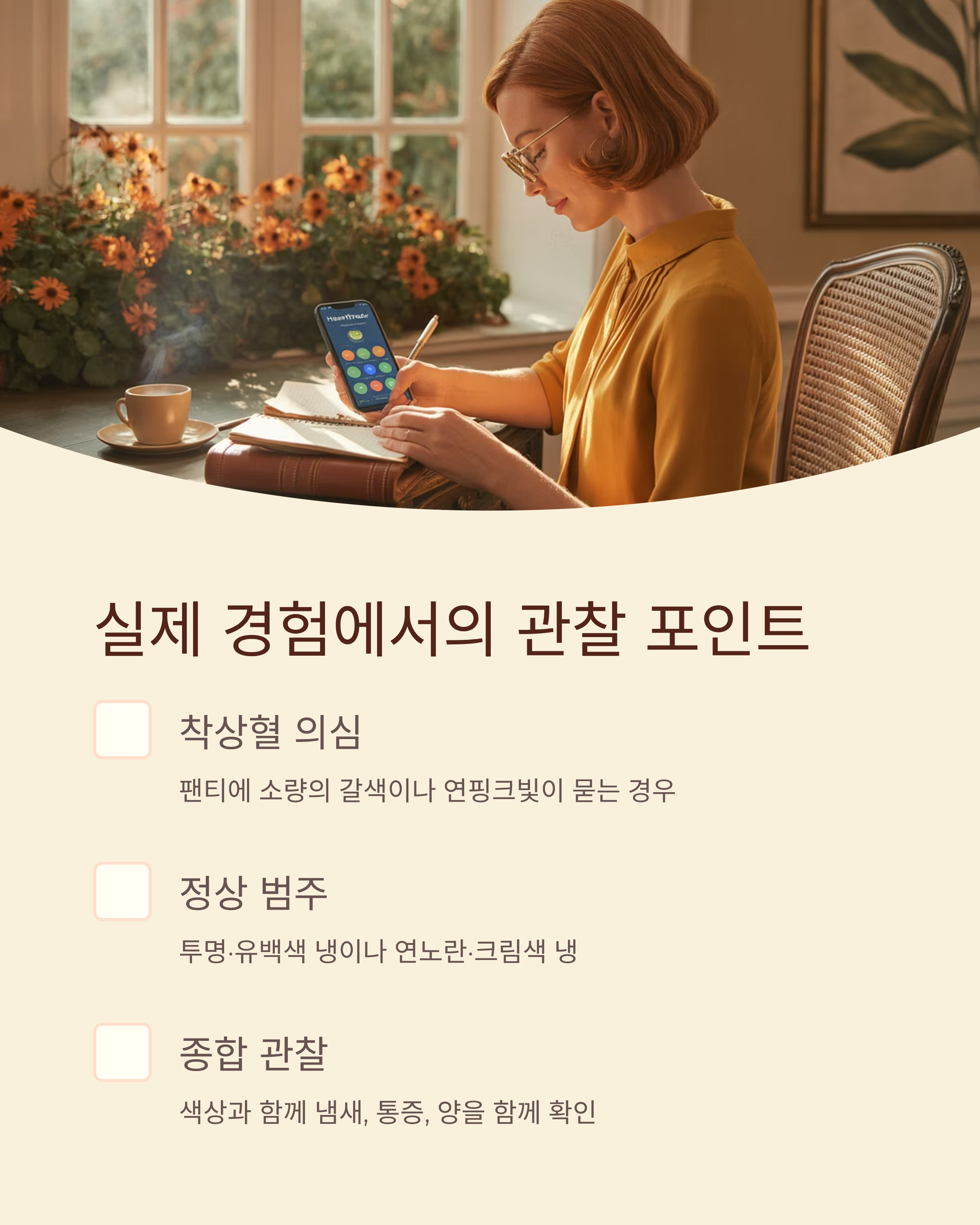 팬티에 소량의 갈색이나 연핑크빛이 묻는 경우, 임신 가능성이 있다면 착상혈일 수 있습니다. 반면 투명·유백색 냉이나 연노란·크림색 냉은 임신 초기 변화로 흔히 볼 수 있으니 크게 걱정하지 않아도 됩니다. 중요한 것은 색상과 함께 냄새, 통증, 양을 종합적으로 관찰하는 것입니다.