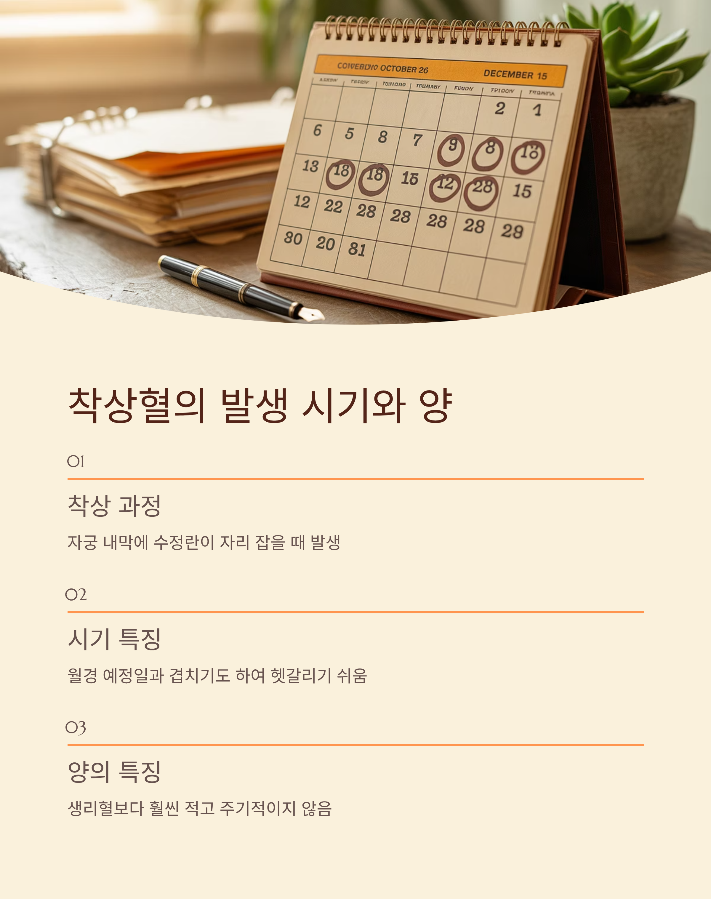 착상혈은 자궁 내막에 수정란이 자리 잡을 때 나타납니다. 시기는 배란 후 6일~12일로, 월경 예정일과 겹치기도 하여 헷갈리기 쉽습니다. 양은 생리혈보다 훨씬 적고 주기적이지 않으며, 소량이 묻어나는 정도가 대부분입니다.