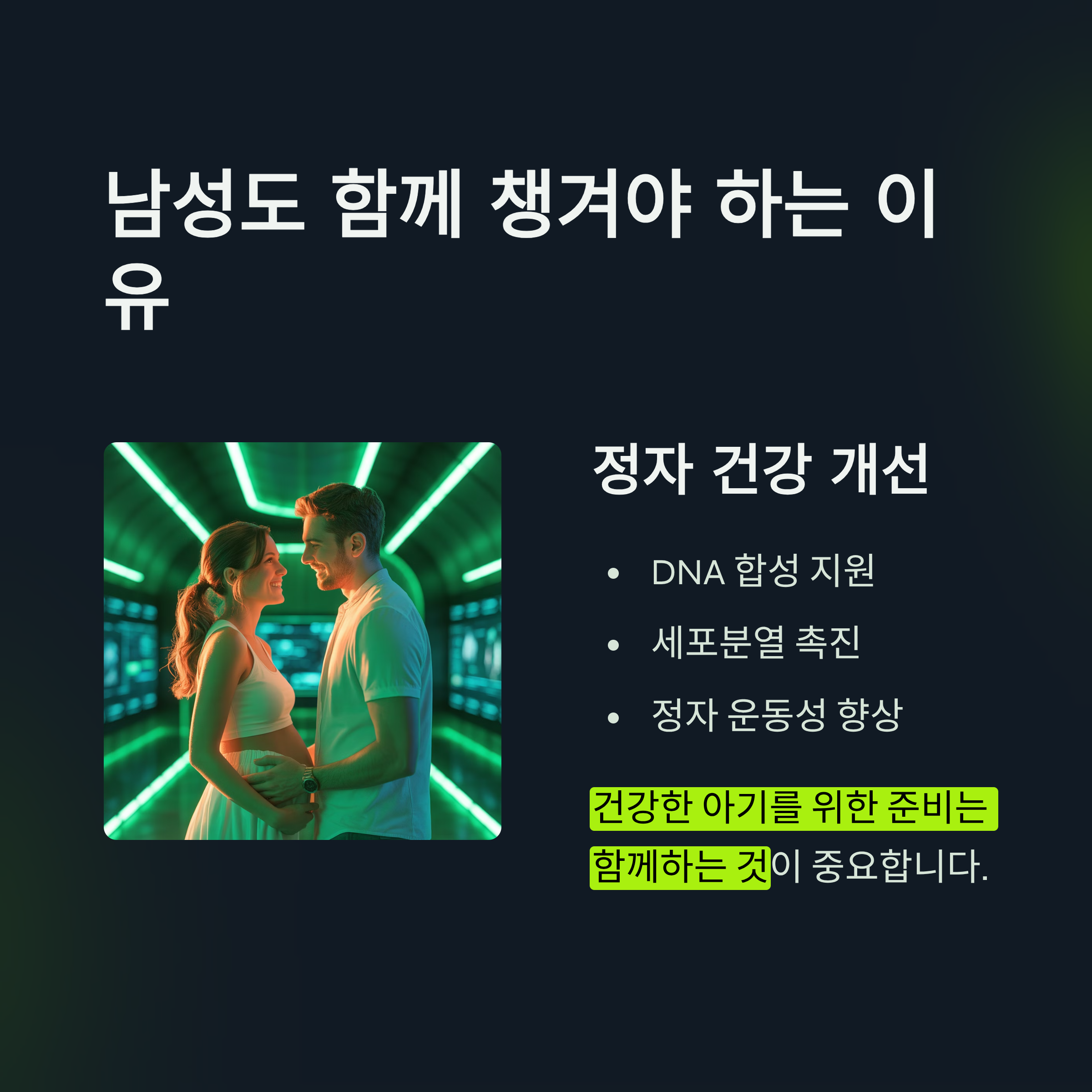 엽산은 여성만의 영역이 아닙니다. 남성의 경우에도 엽산은 정자의 DNA 합성, 세포분열, 정자 운동성에 관여해요. 연구에 따르면 엽산을 충분히 섭취한 남성은 정자 건강이 개선되는 경향을 보였습니다.