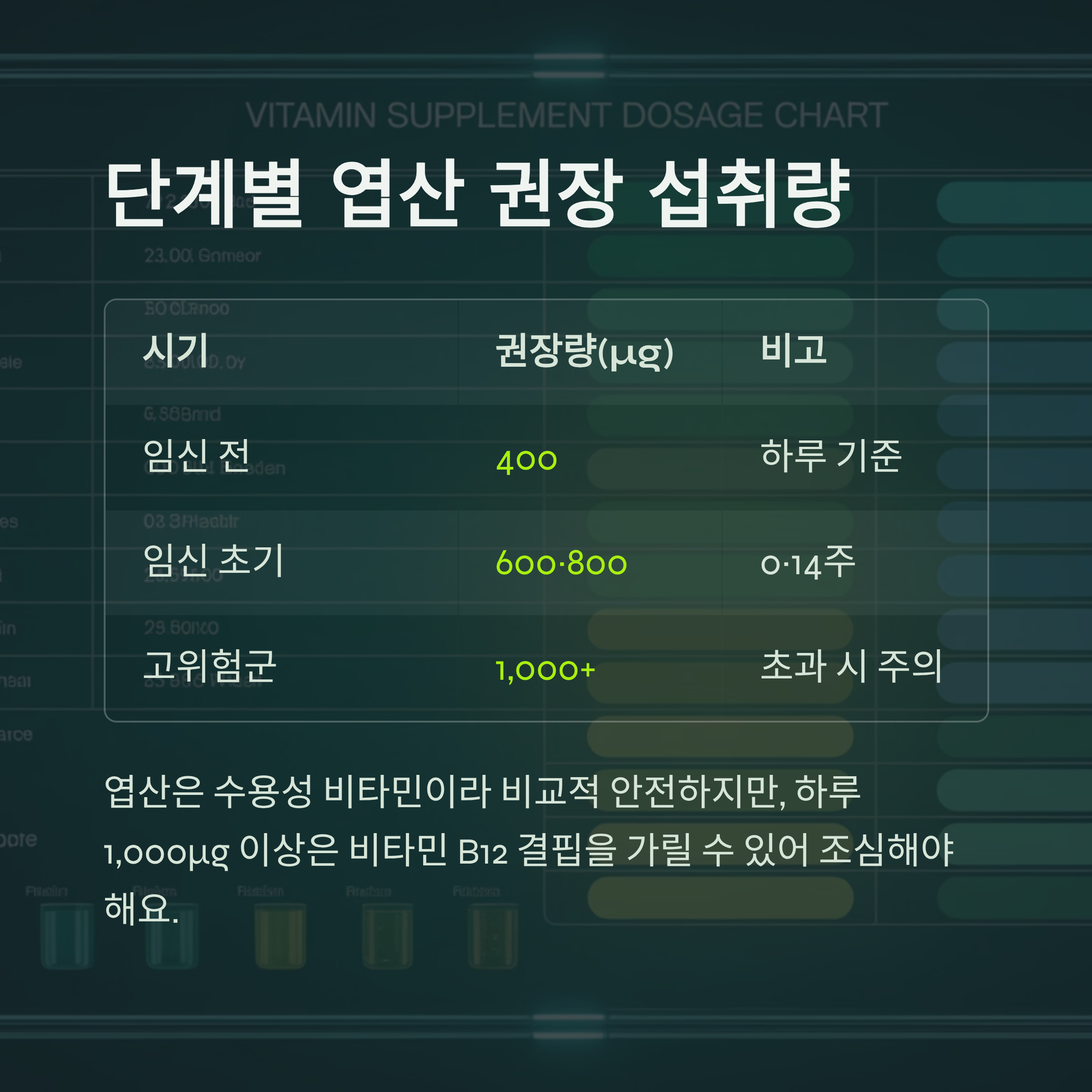 | 임신 초기(0~14주) | 600~800 | 일부 가이드라인은 800까지 |