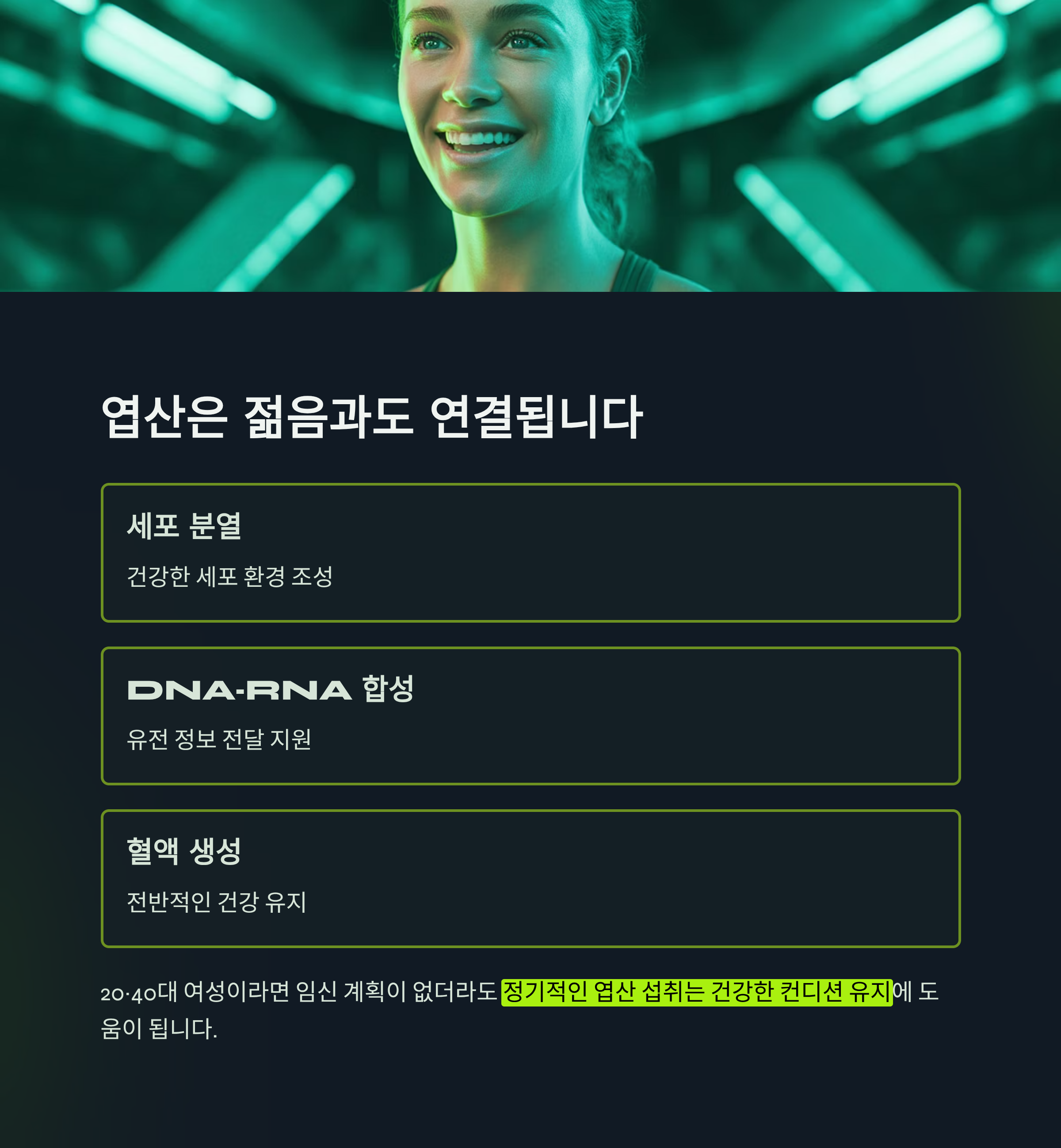 특히 20~40대 여성이라면 임신 계획이 없더라도 정기적인 엽산 섭취는 건강한 컨디션 유지와 젊은 세포 환경을 만드는 데 도움이 될 수 있습니다.