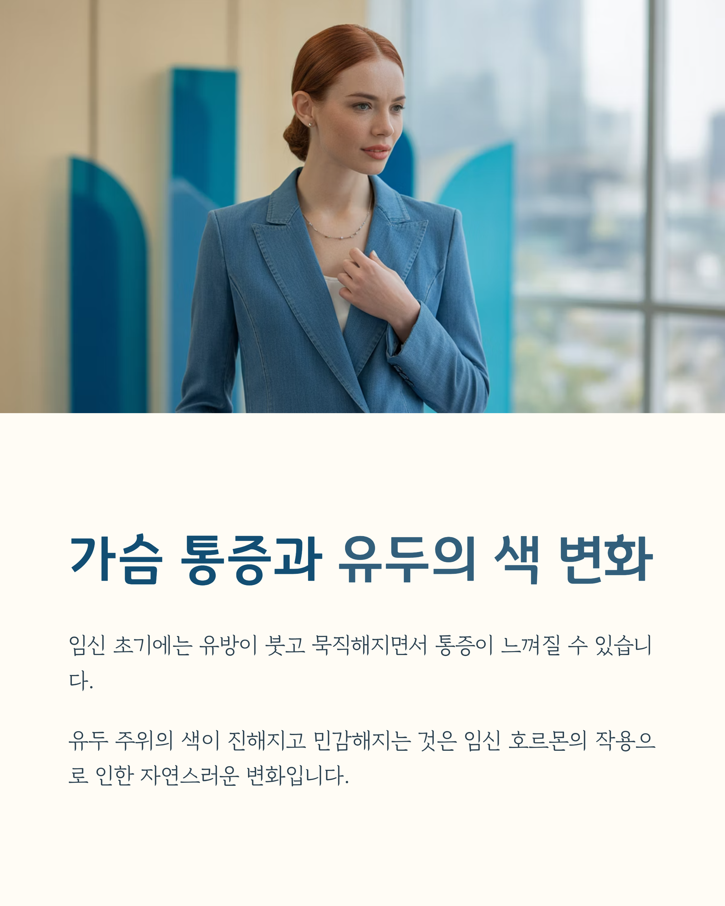임신 초기에는 유방이 붓고 묵직해지면서 통증이 느껴질 수 있습니다. 유두 주위의 색이 진해지고 민감해지기도 하는데요, 이는 임신 호르몬의 작용으로 인한 자연스러운 변화입니다.