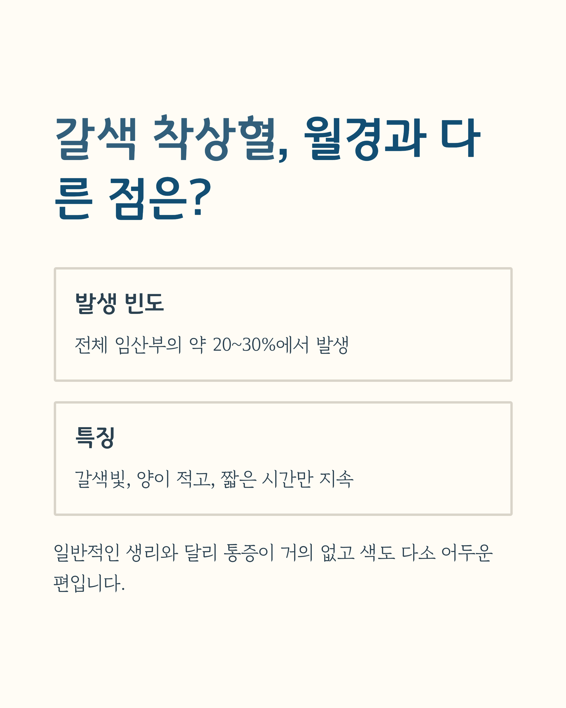전체 임산부의 약 20%~30%에서 임신 초기 착상혈이 나타납니다. 갈색빛을 띠며 양이 적고 짧은 시간만 지속되는 게 특징인데요, 일반적인 생리와 달리 통증이 거의 없고 색도 다소 어두운 편입니다.