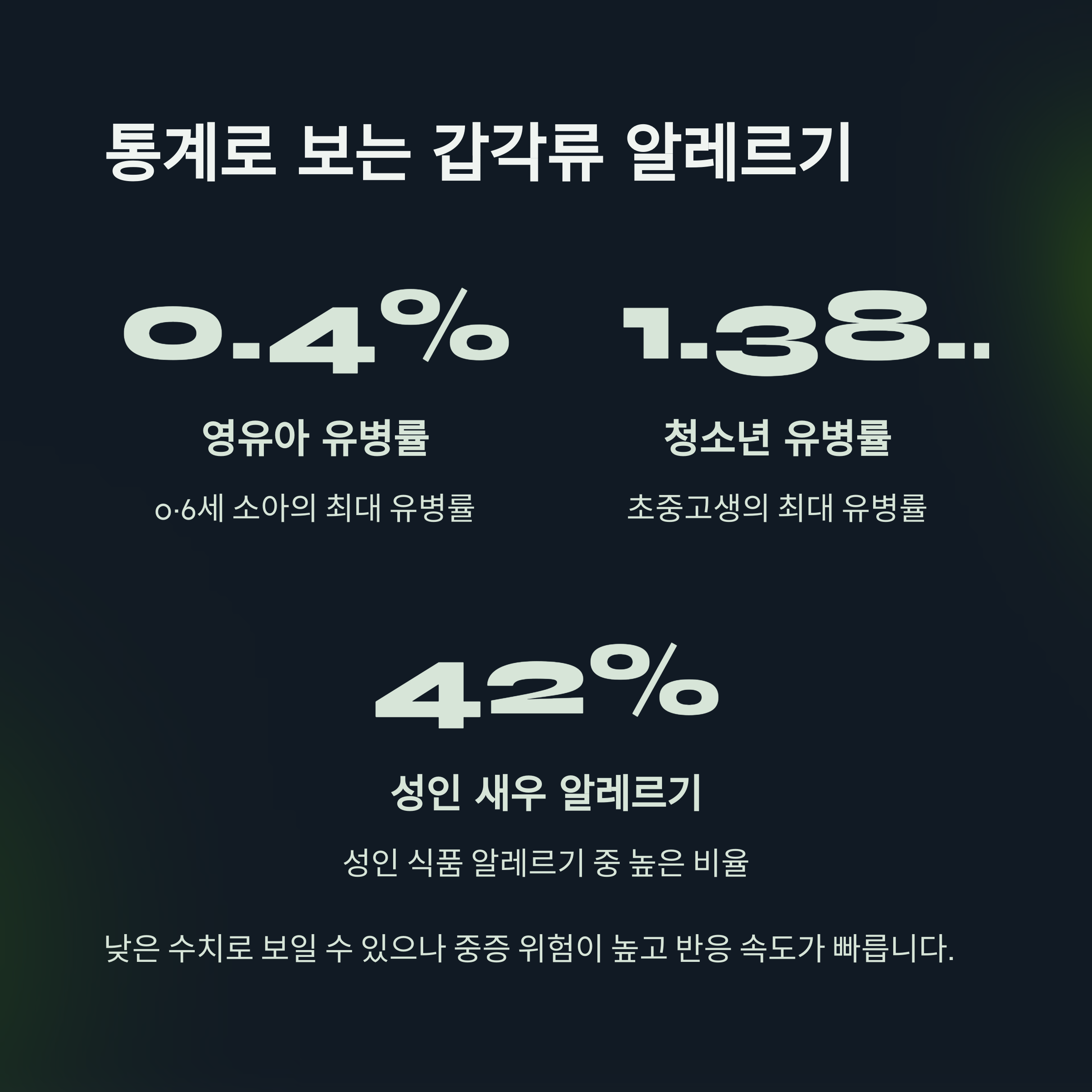 | 전체 식품 알레르기 중 갑각류 비율 | 약 3.5%~7.1% |