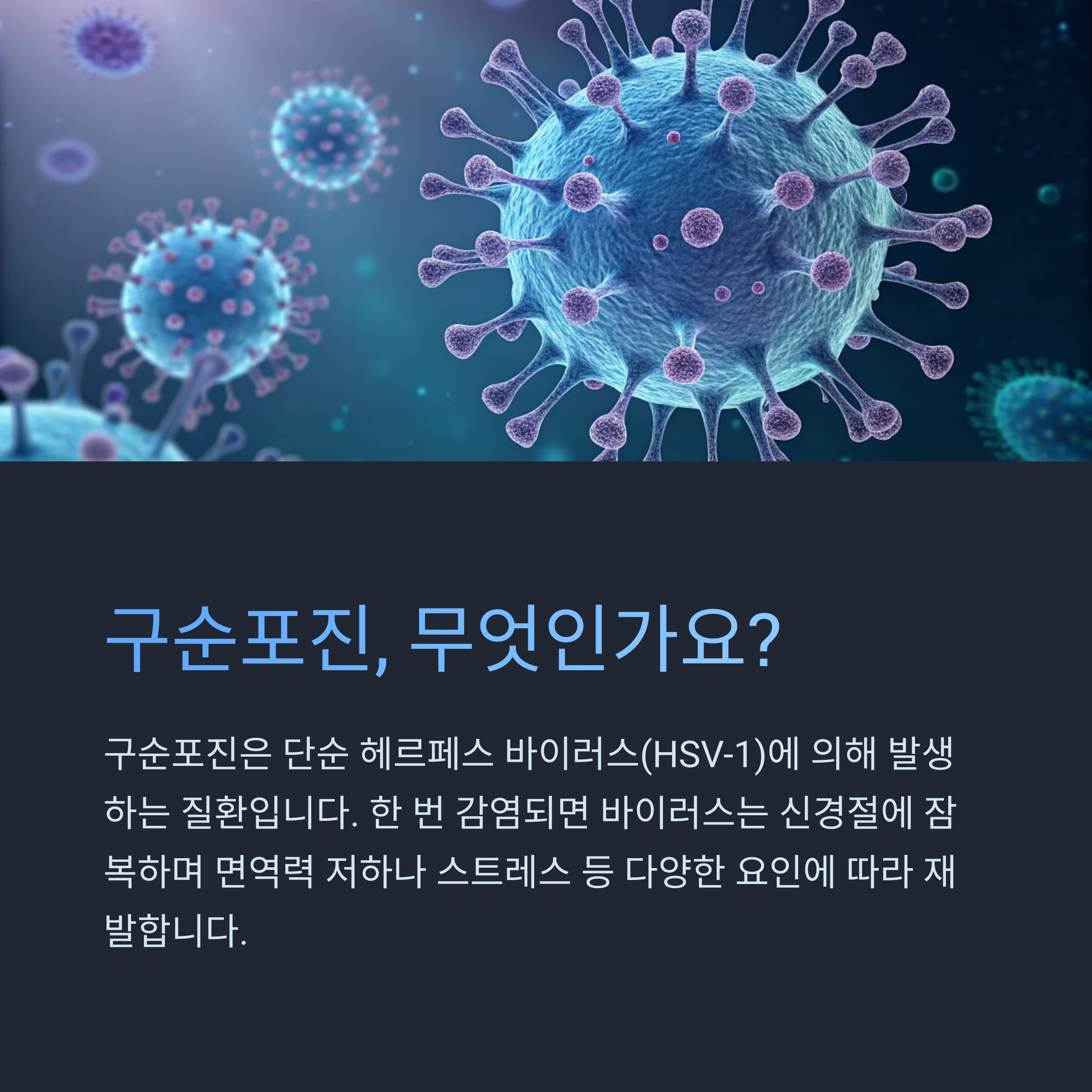입술 주변 포진, 즉 구순포진은 단순 헤르페스 바이러스(HSV-1)에 의해 발생하는 질환입니다