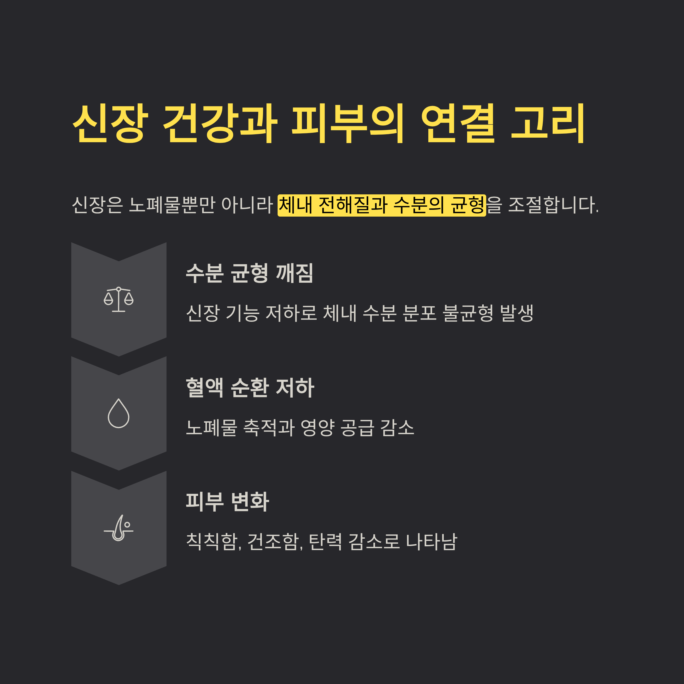 신장 기능이 저하되면 수분이 적절히 분포되지 못해 피부까지 영향을 받습니다.