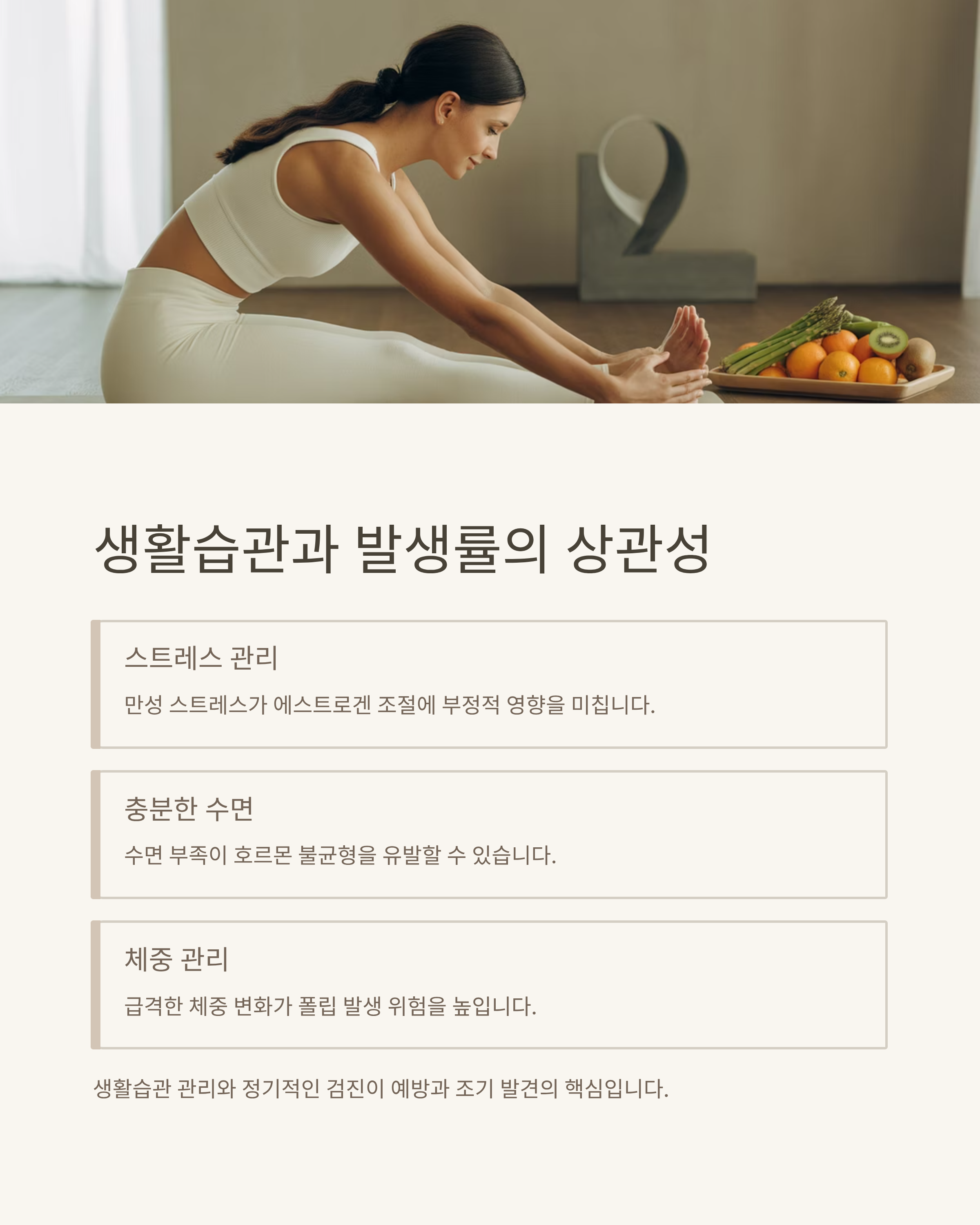 스트레스, 수면 부족, 다이어트와 같은 생활습관 요인 역시 에스트로겐 조절에 영향을 미칩니다. 이로 인해 일부 여성은 폴립 발생 위험이 높아질 수 있습니다. 즉, 생활습관 관리와 정기적인 검진이 자궁경부용종 예방 및 조기 발견의 중요한 열쇠라 할 수 있습니다.