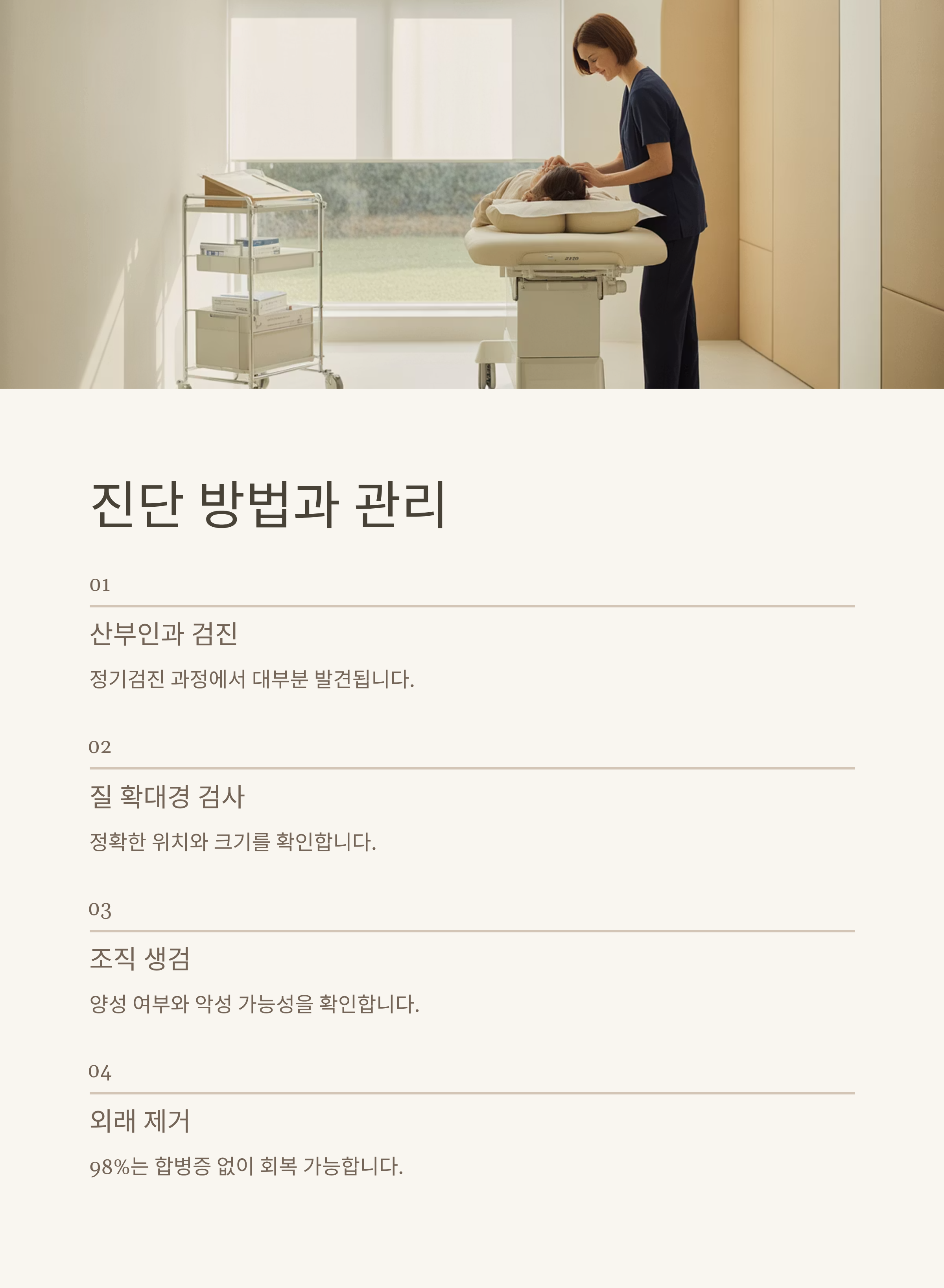 대부분의 자궁경부용종은 산부인과 검진 과정에서 발견됩니다. 주로 질 확대경 검사, 조직 생검 등을 통해 양성 여부와 악성 가능성을 확인합니다. 치료는 간단히 외래에서 제거할 수 있으며, 약 98%는 합병증 없이 회복이 가능합니다.