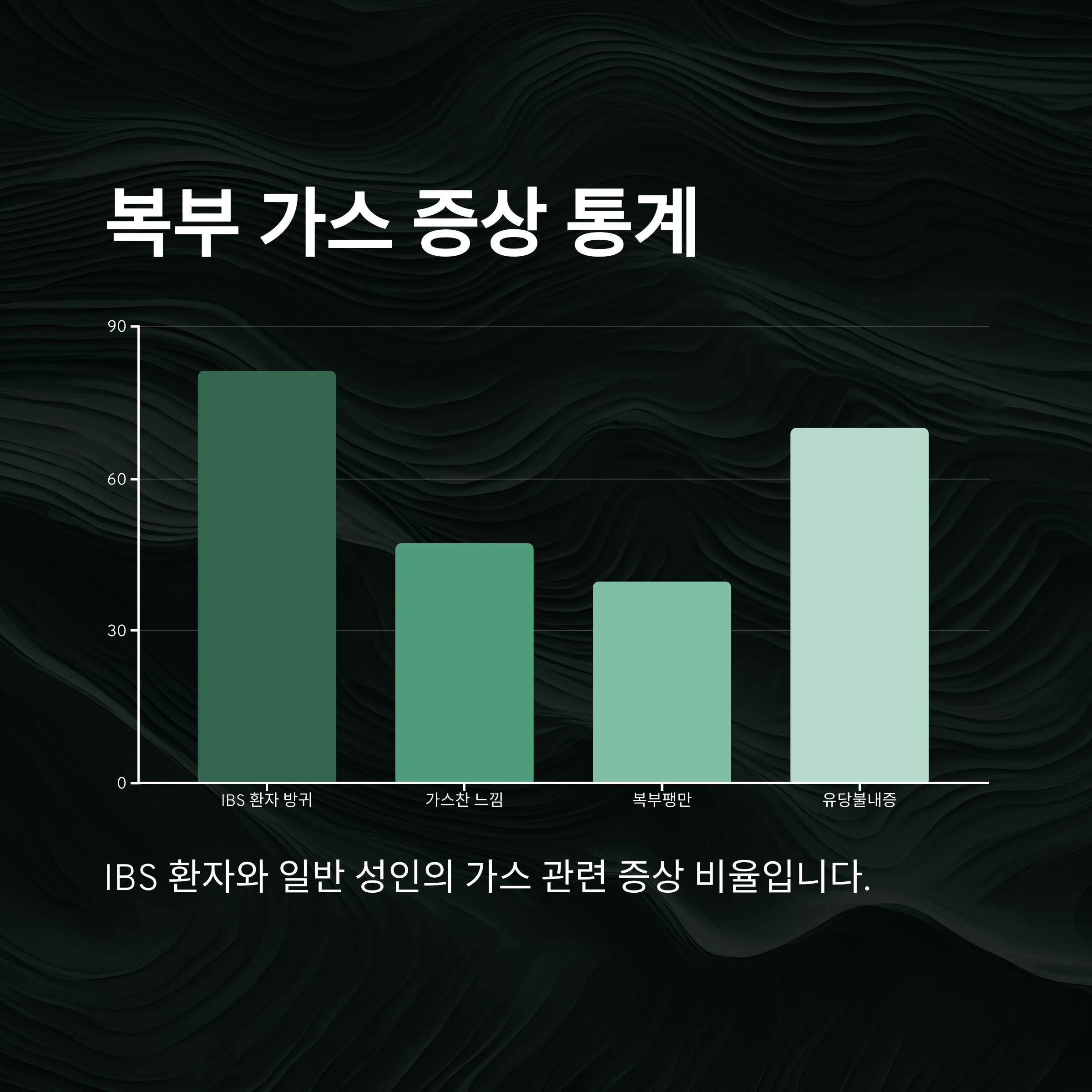 "IBS 환자의 81.3%가 방귀, 47.2%가 가스찬 느낌, 39.6%가 복부팽만을 호소합니다."