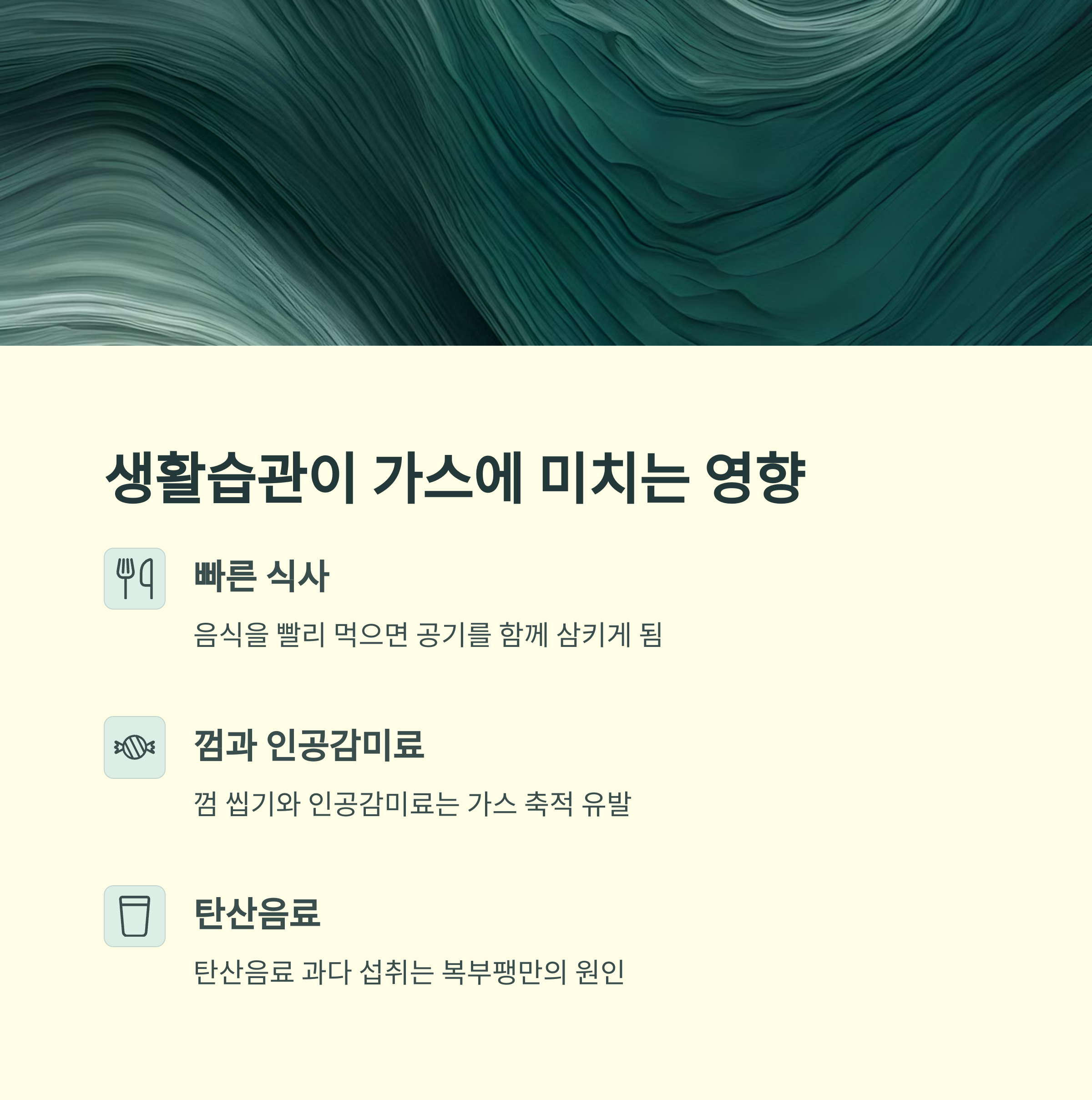 음식 섭취 시 빠르게 먹거나 껌을 자주 씹는 습관, 흡연, 불안 등은 공기를 삼키는 행위로 이어져 가스 축적을 유발합니다. 또한 탄산음료, 인공감미료 과다 섭취도 복부팽만의 원인이 됩니다.