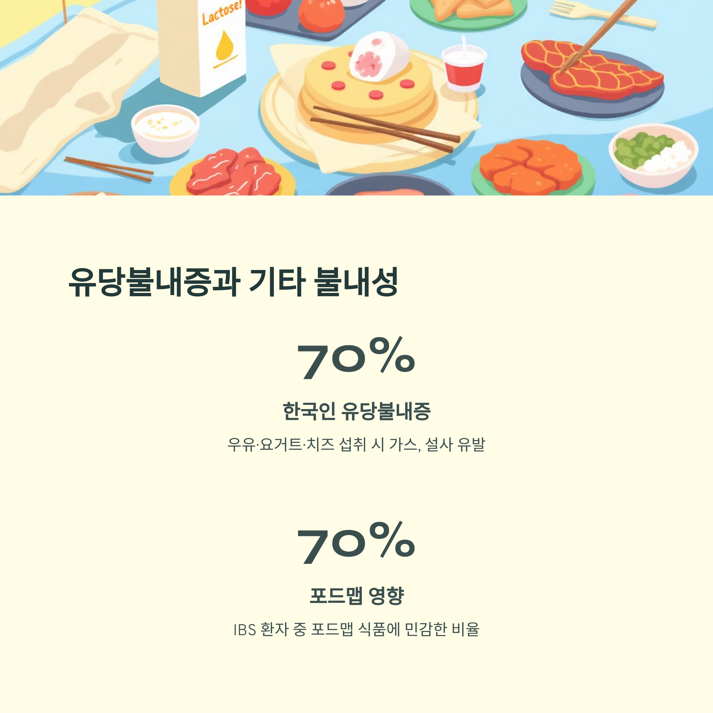 한국인 성인의 약 70%가 유당불내증을 갖고 있으며, 이는 우유·요거트·치즈 섭취 시 가스, 설사, 복부팽만을 유발할 수 있습니다.