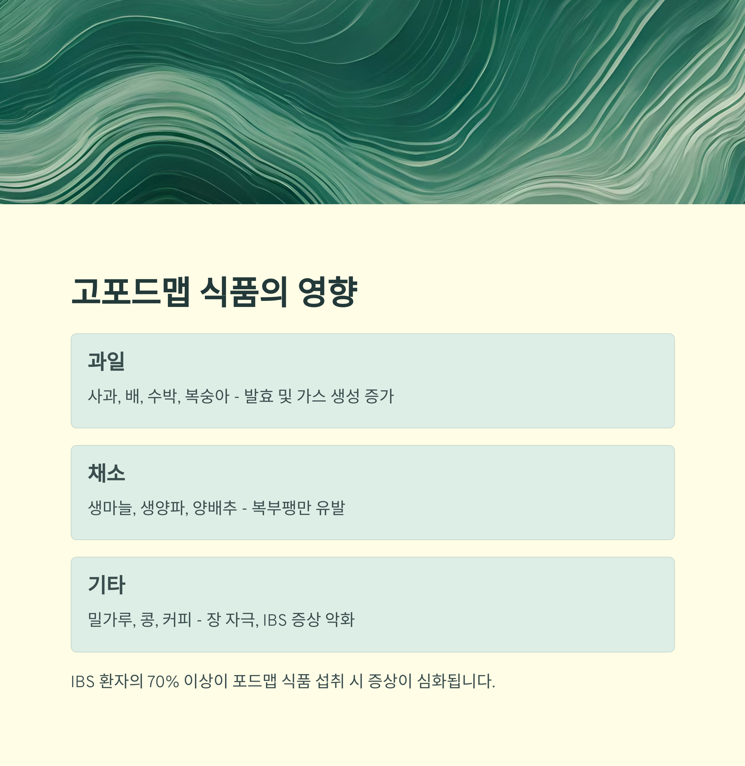 | 포드맵 과다 섭취 | 방귀, 트림, 복통 | IBS 환자의 70% |