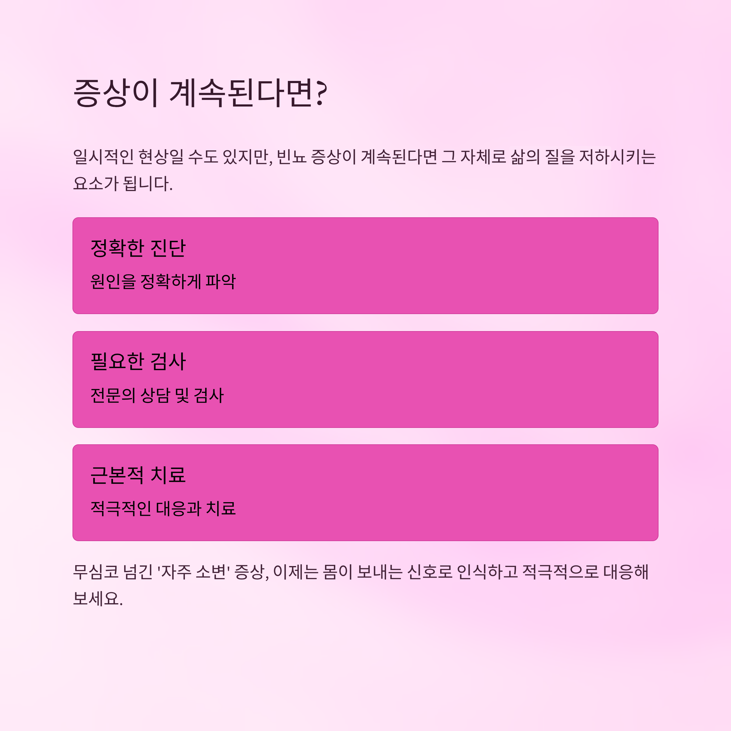 일시적인 현상일 수도 있지만, 빈뇨 증상이 계속된다면 그 자체로 삶의 질을 저하시키는 요소가 됩니다. 원인을 정확하게 파악하고, 필요한 경우 검사를 통해 근본적인 치료를 받는 것이 중요합니다.