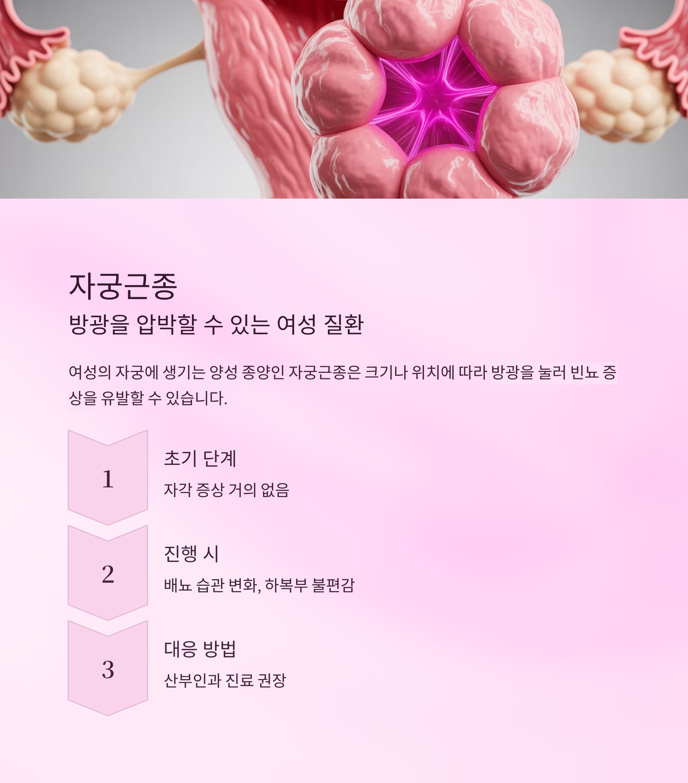 여성의 자궁에 생기는 양성 종양인 자궁근종은 크기나 위치에 따라 방광을 눌러 빈뇨 증상을 유발할 수 있습니다. 초기에는 자각 증상이 거의 없지만, 배뇨 습관의 변화나 하복부 불편감이 느껴진다면 산부인과 진료를 받아보는 것이 좋습니다.