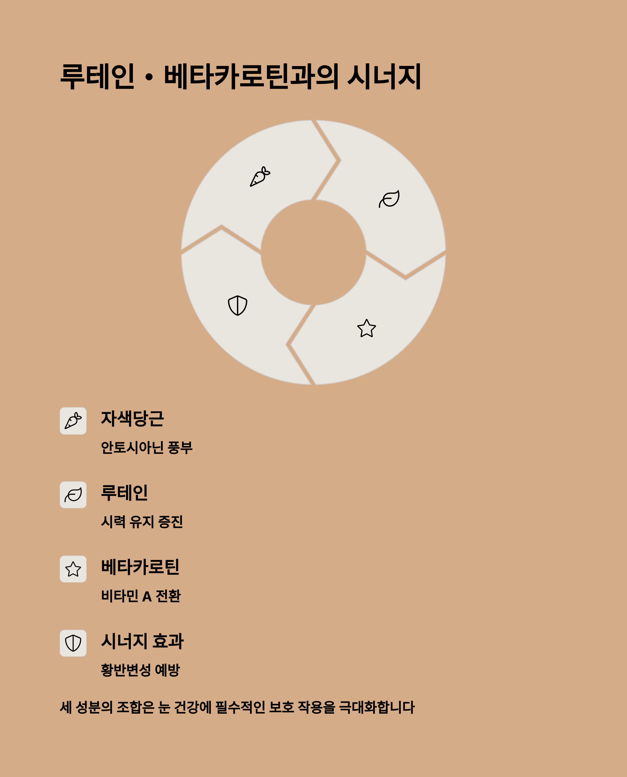 | 망막 보호, 항산화 작용 | 황반변성 예방, 시력 보호 | 비타민 A 전구체, 야맹증 예방 |