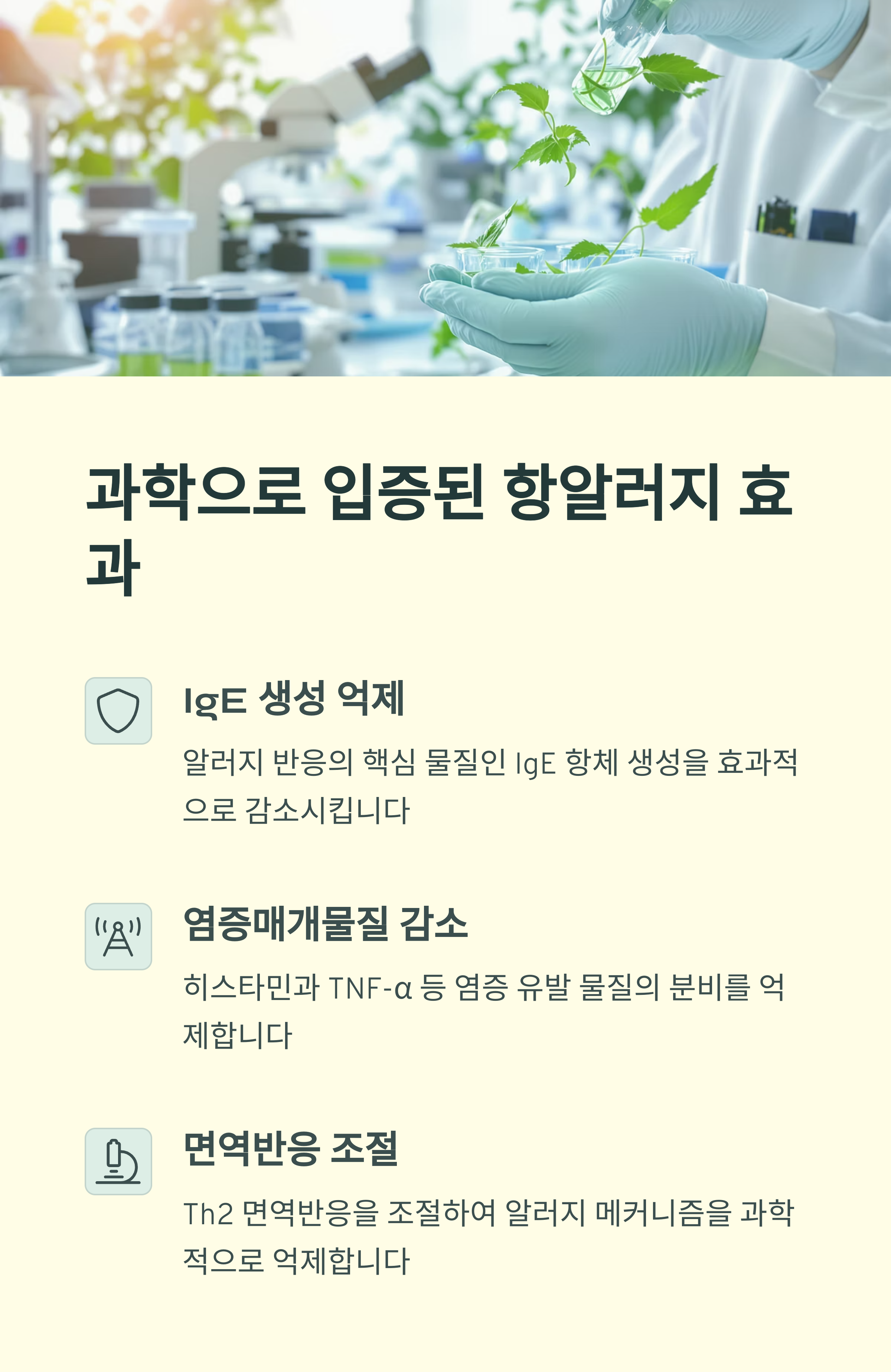 | 루테올린, 로즈마린산, 프릴알데히드 | IgE 억제, 염증 매개물질 감소 | IgE 50%↓, Th2 사이토카인 70%↓ |