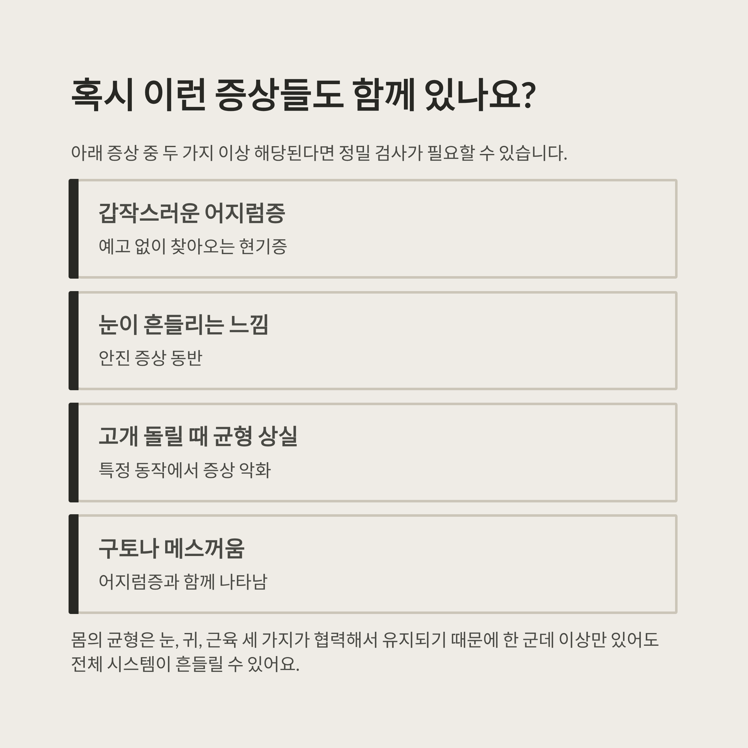 소뇌 이상, 뇌졸중 전조 증상 등 중추신경계 문제로 평형감각이 무너지는 경우도 있기 때문이죠.