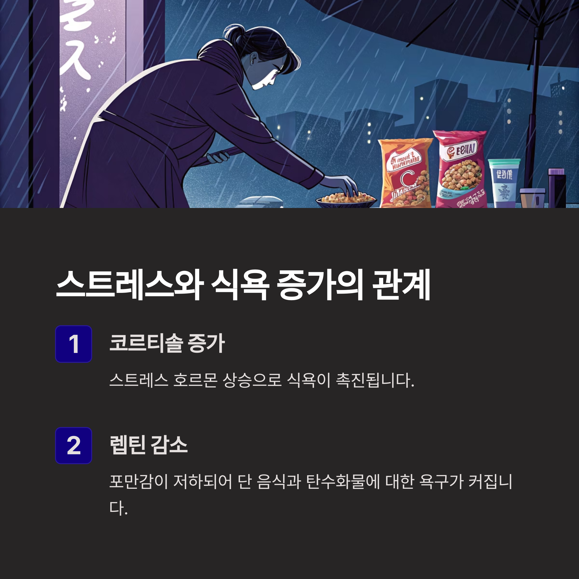 장마철에는 스트레스 호르몬인 코르티솔이 증가합니다. 동시에 식욕 억제 호르몬인 렙틴은 감소합니다.