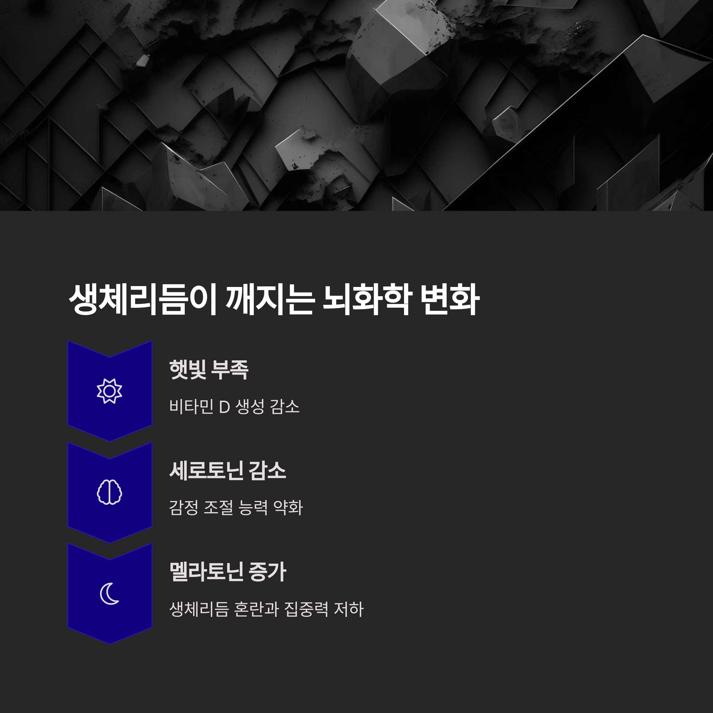 세로토닌이 부족해지면 감정의 조절 능력이 약해져 우울과 짜증, 무기력함이 쉽게 나타납니다. 반대로, 멜라토닌은 어둠 속에서 과도하게 분비되어 생체리듬을 혼란시키고, 낮 시간에도 집중력과 에너지 수준이 떨어지게 만듭니다.